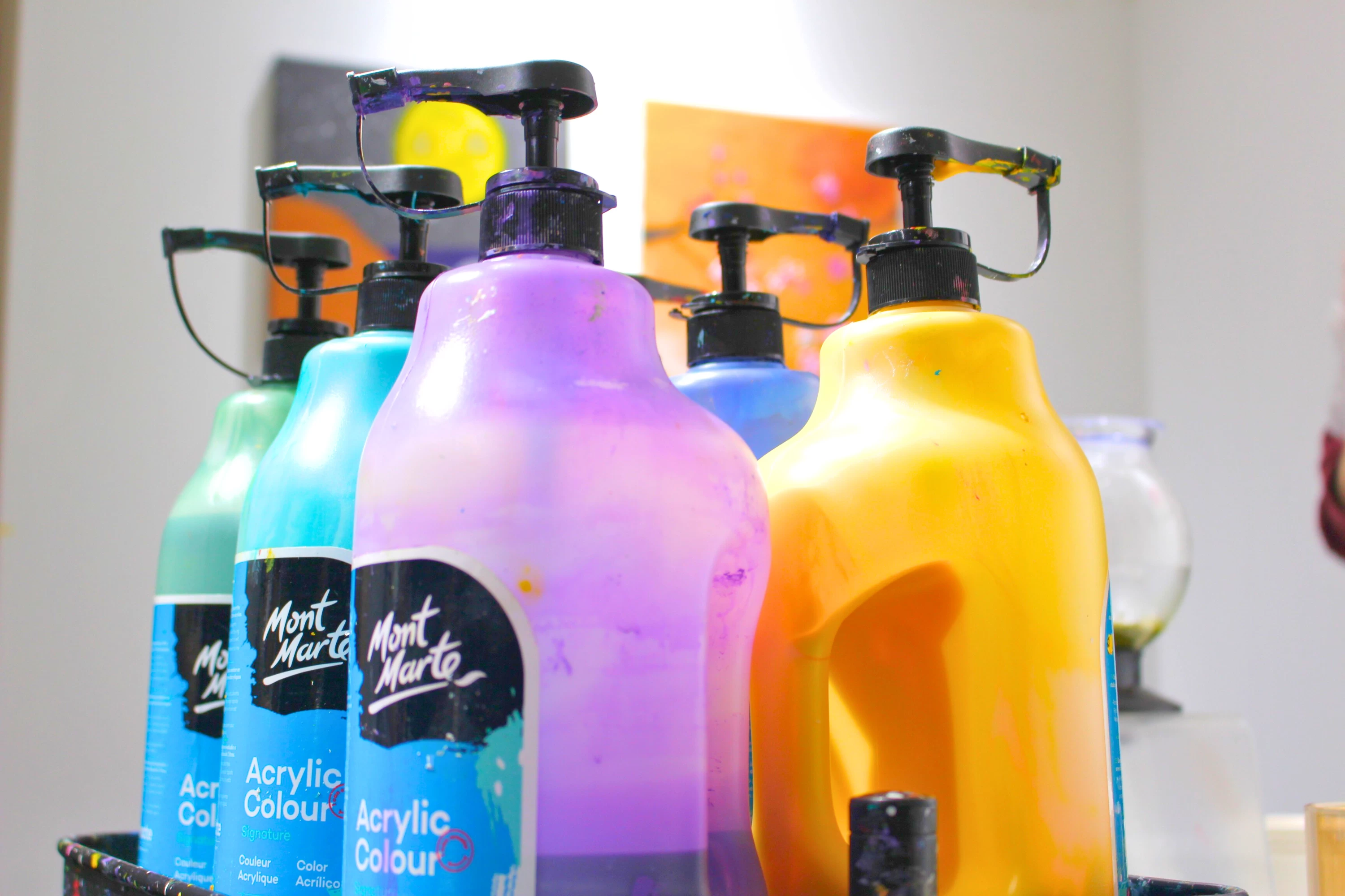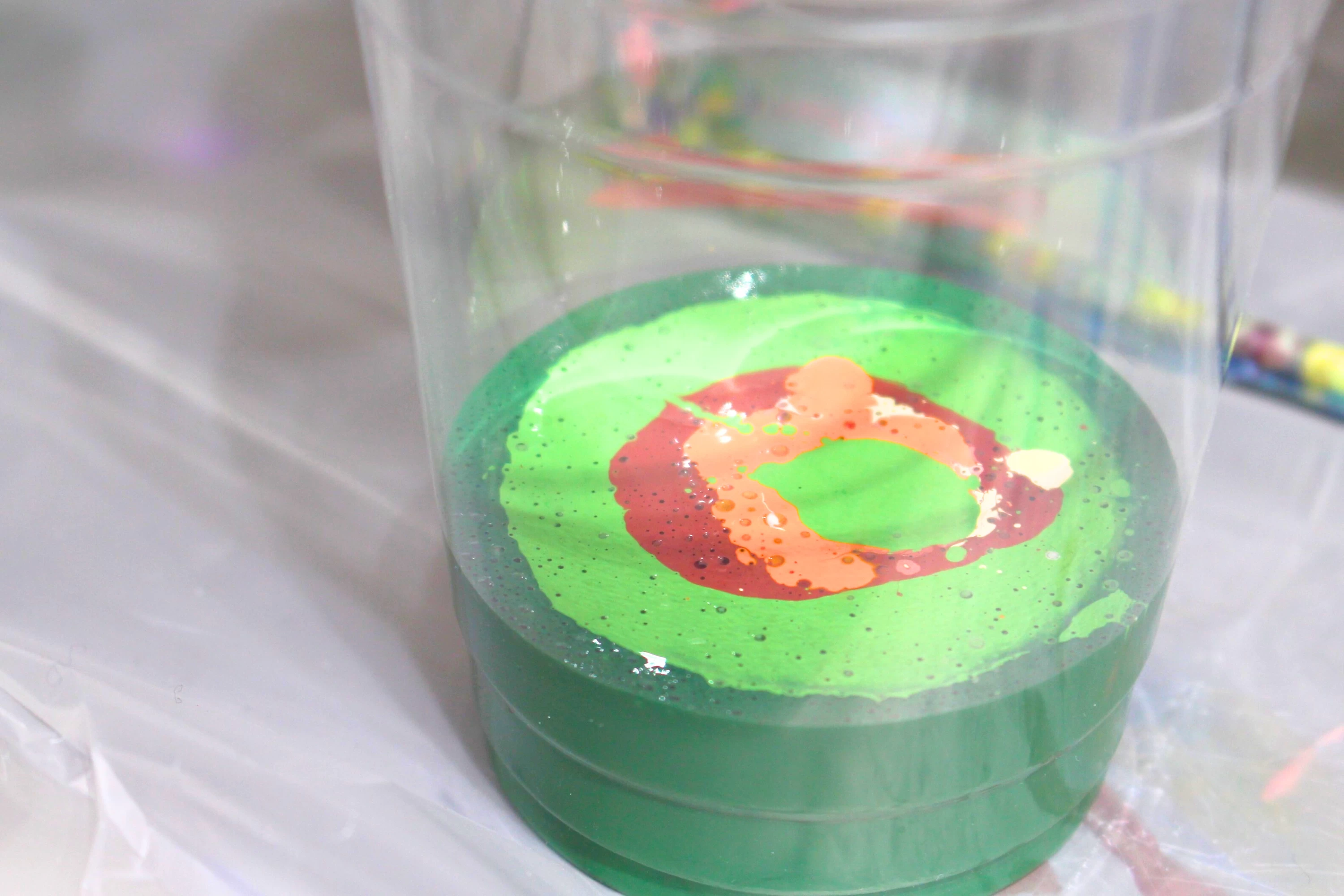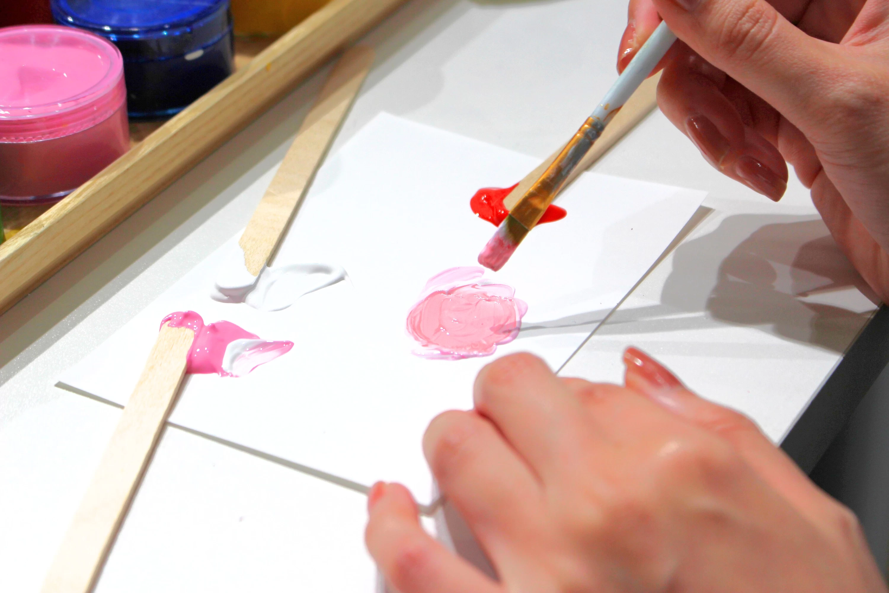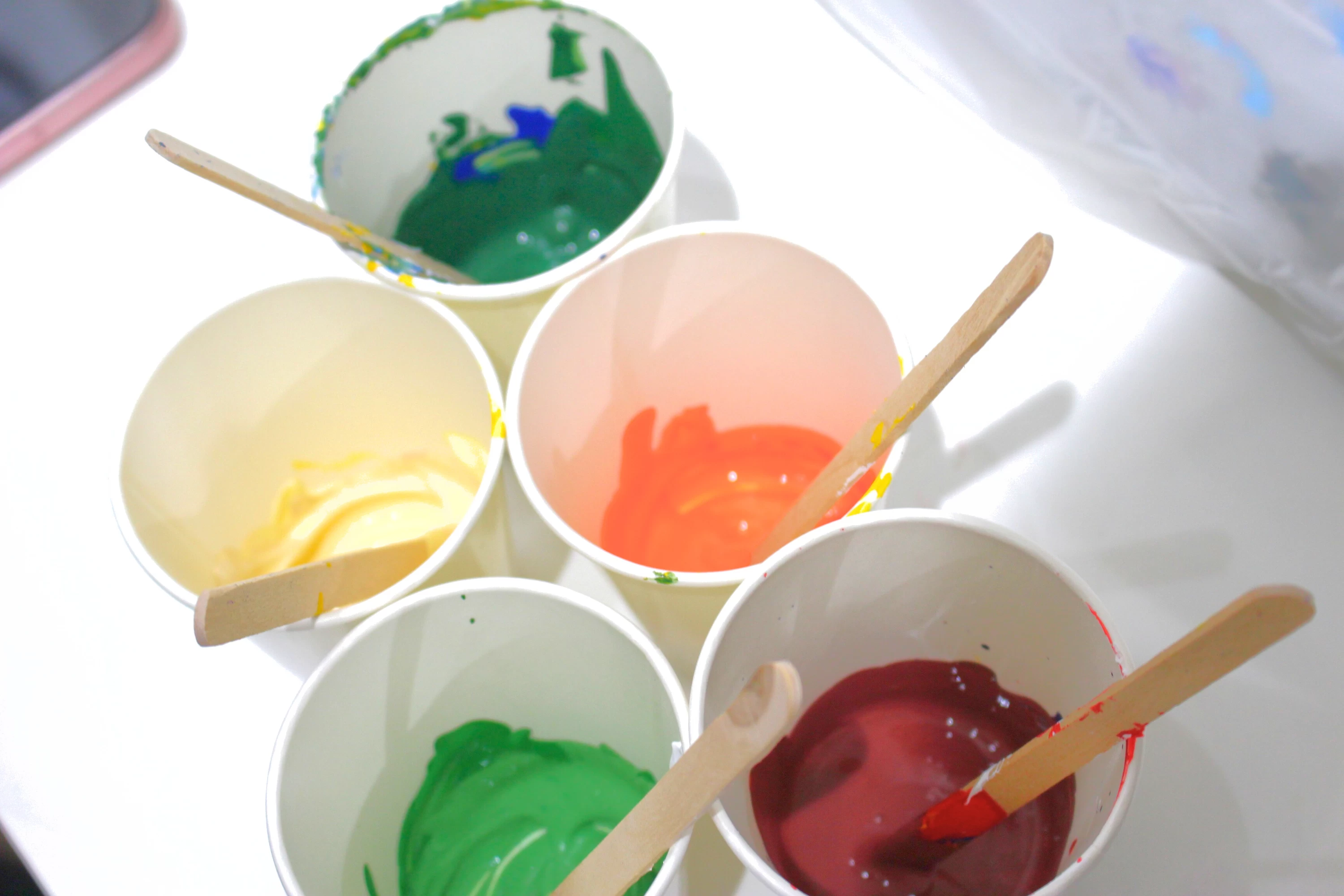 次に、色を最大5色まで選びます。絵の具は赤・青・黄など基本色が揃っており、赤と黄を合わせてオレンジにするように、足りない色は絵の具同士を混ぜて作ることも可能。さらに、白やほかの色を加えることで明るさや濃さも調整できます。色は1色ずつカップに分けて作り、それぞれに水を加えたらすべて1つのカップに投入。私はベースカラーを緑にし、茶色・オレンジ・アイボリー・濃さを変えた緑をもう1色作りました。
