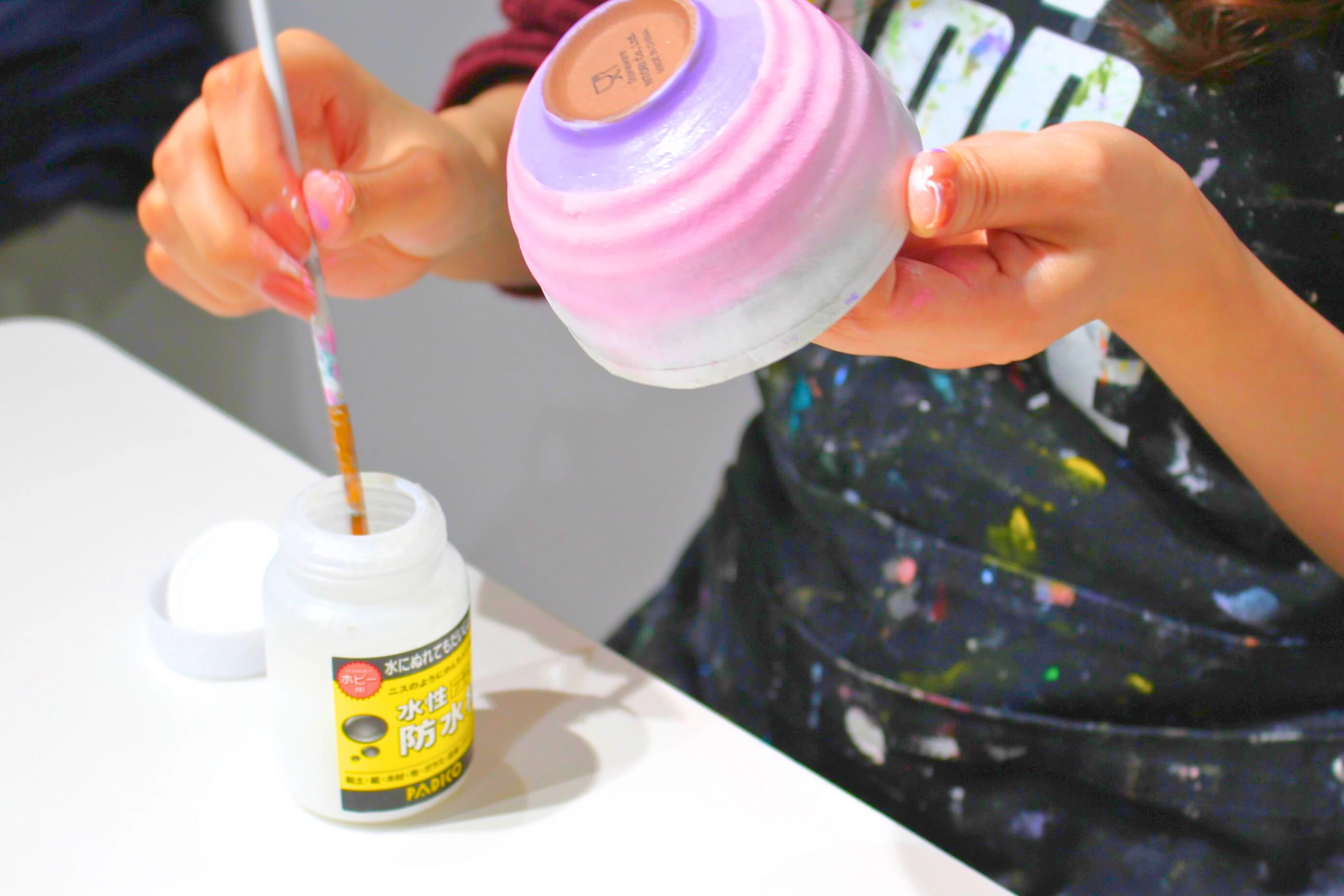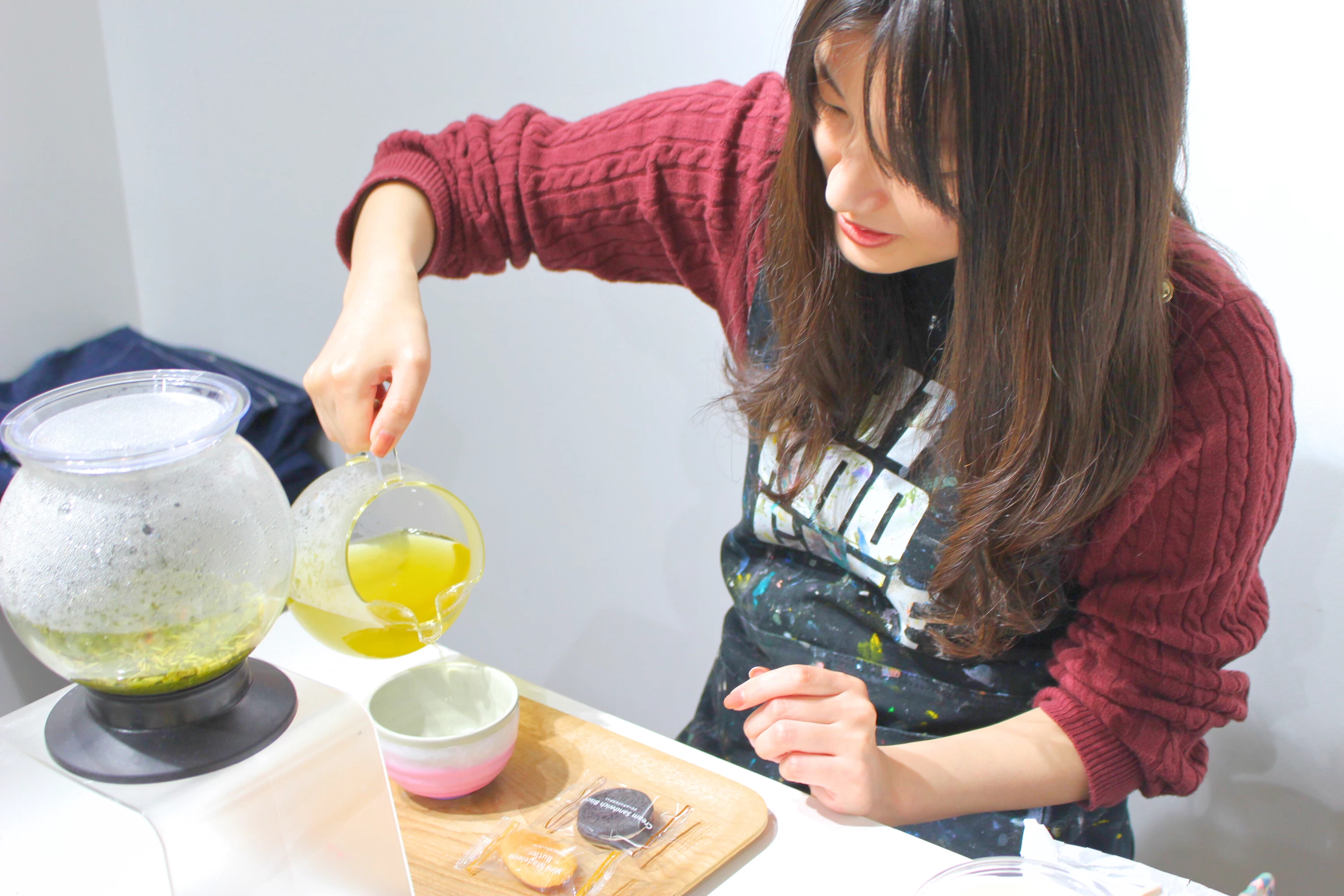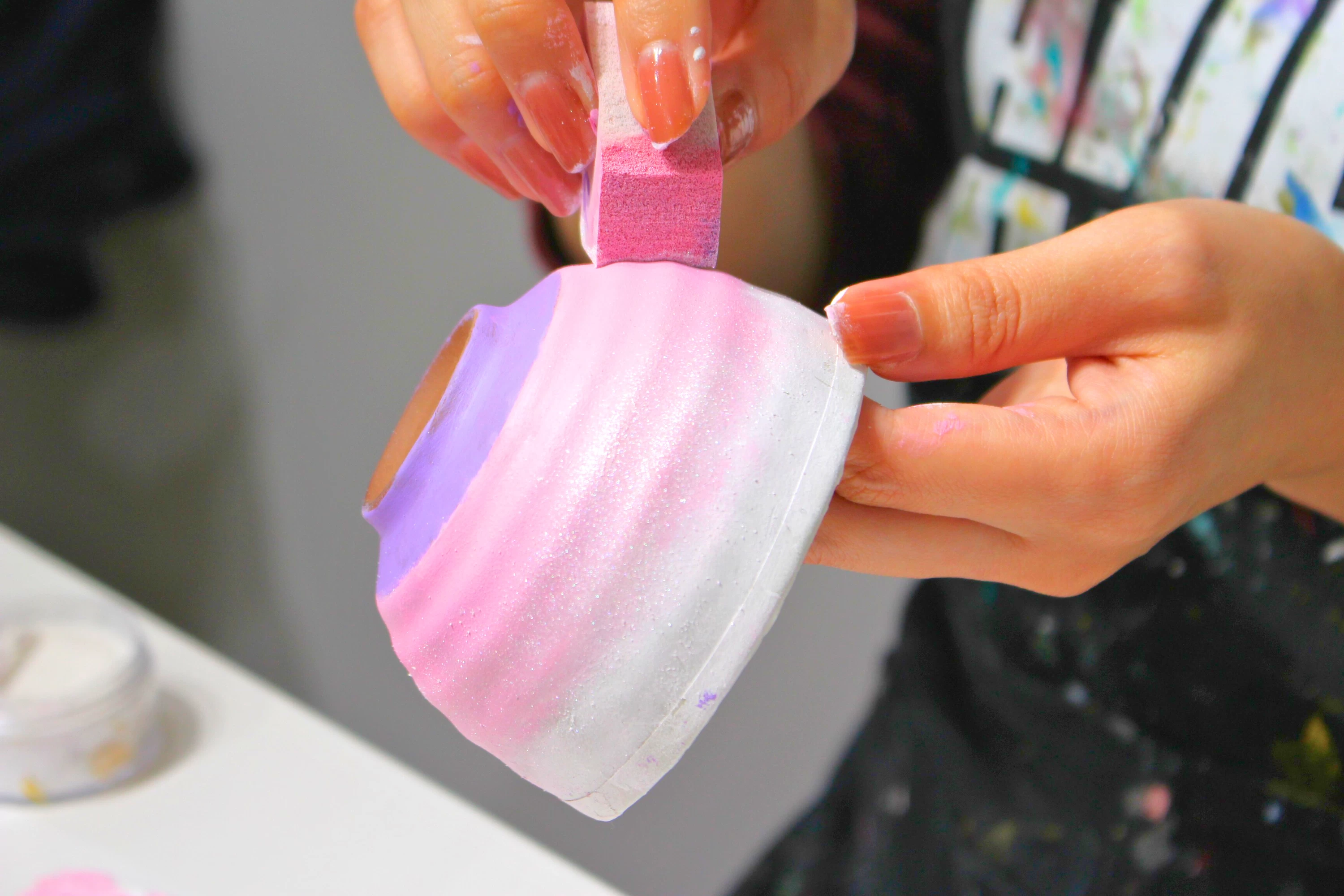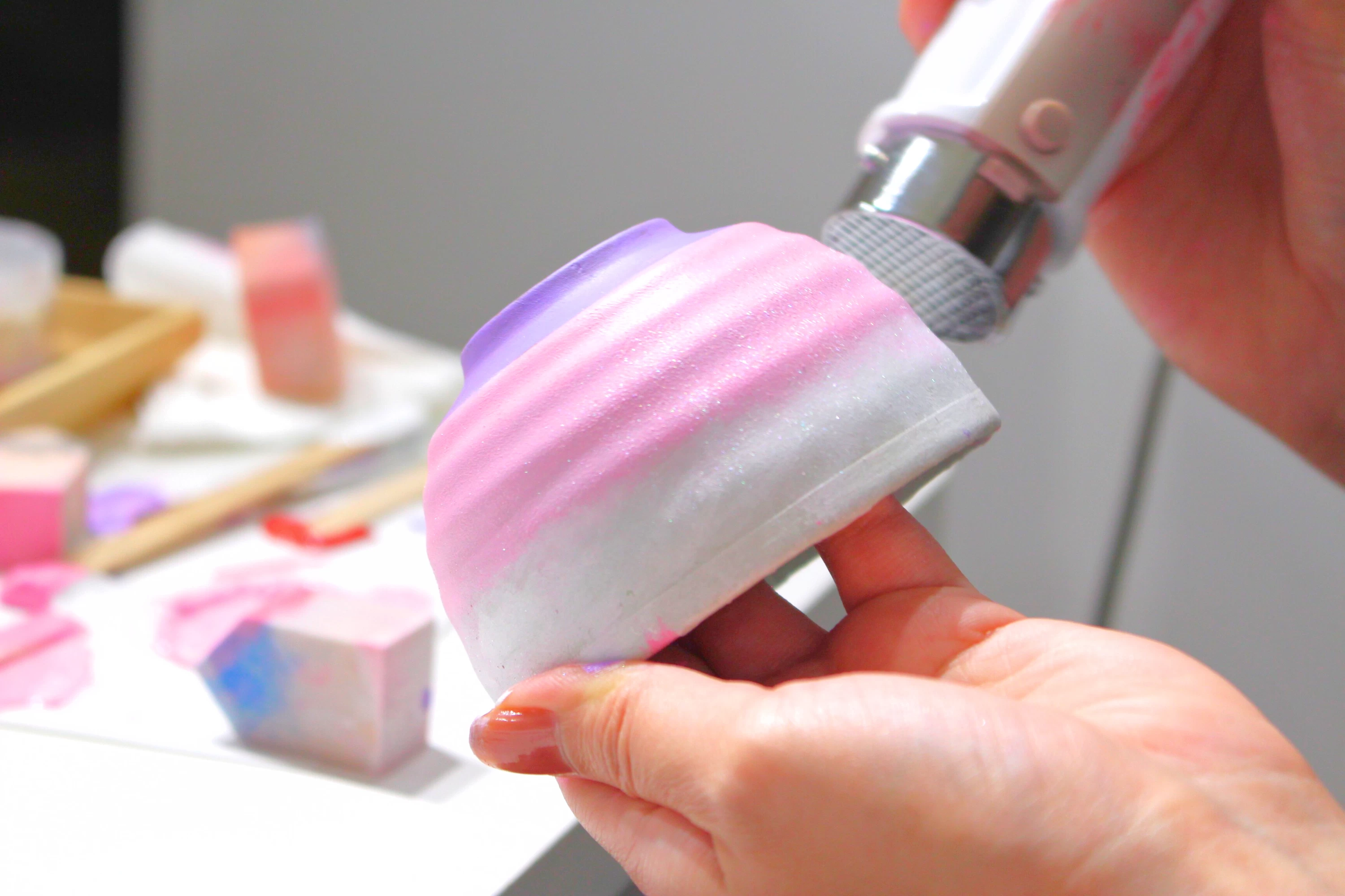 次に、用意された色の中から使うものを選び、必要に応じて混ぜながら色味を調整します。私はグラデーションに挑戦したかったので、スタッフに教えてもらいながら、スポンジでたたいたり、こすることで少しずつ茶器に表情を加えていきました。