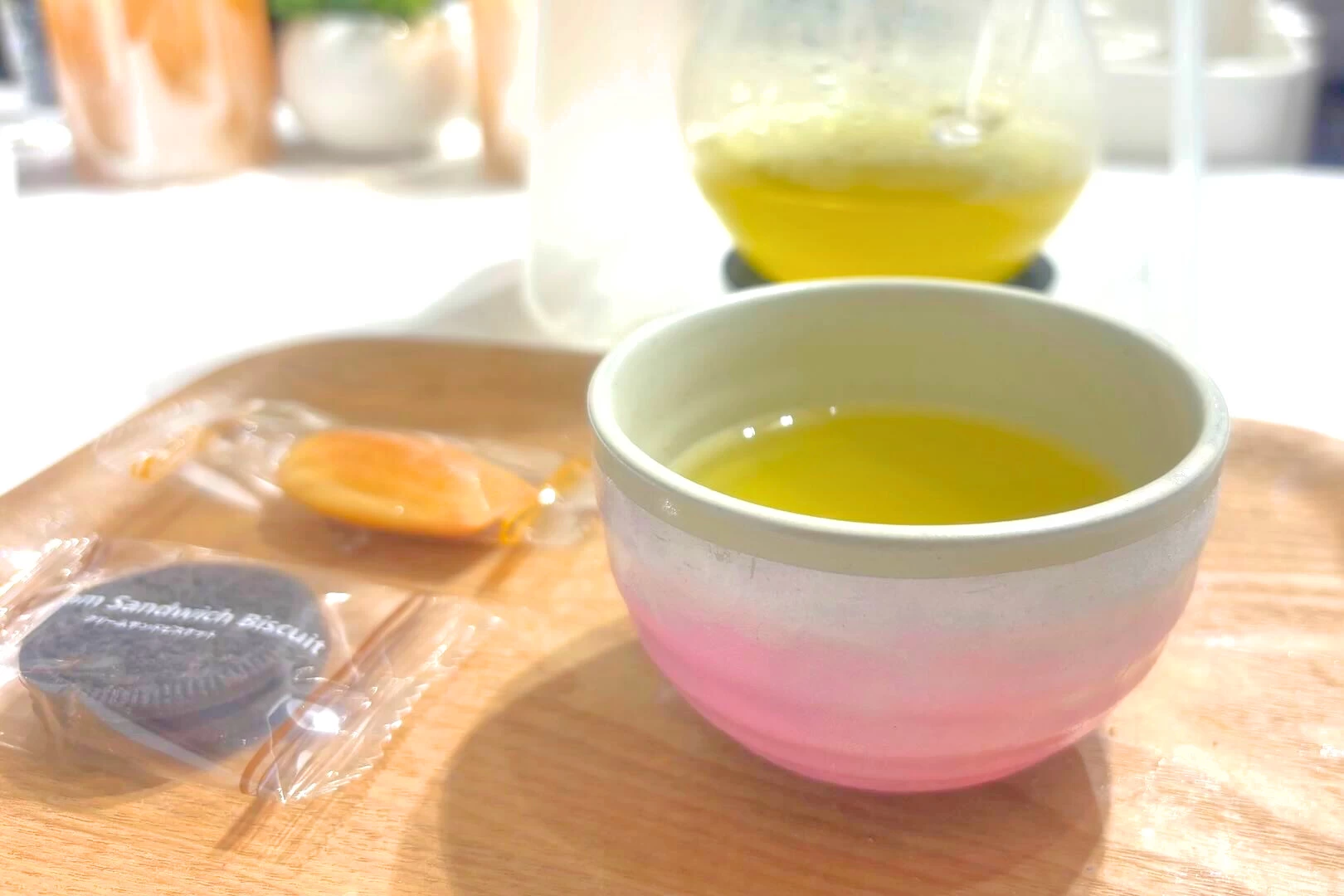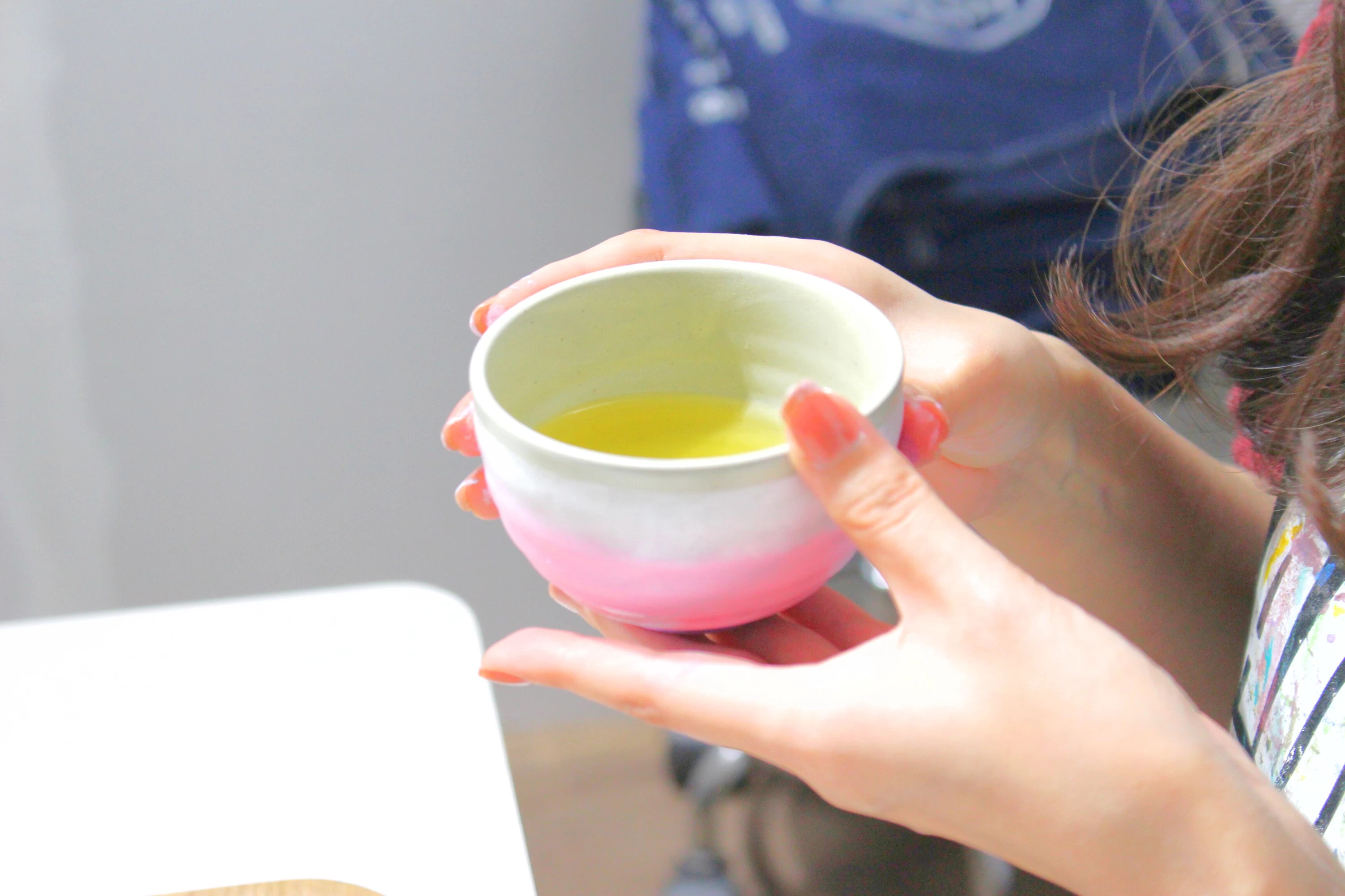完成した茶器にお茶を入れ、お菓子と一緒に味わえるのも、このワークショップならではの楽しみです。制作だけで終わらず、完成品をその場で使えることで、体験の満足感もひとしお。自分の手で絵付けした茶器で飲むお茶は、格別に美味しく感じました。茶器は当日お持ち帰りできるのも嬉しいポイントです。
