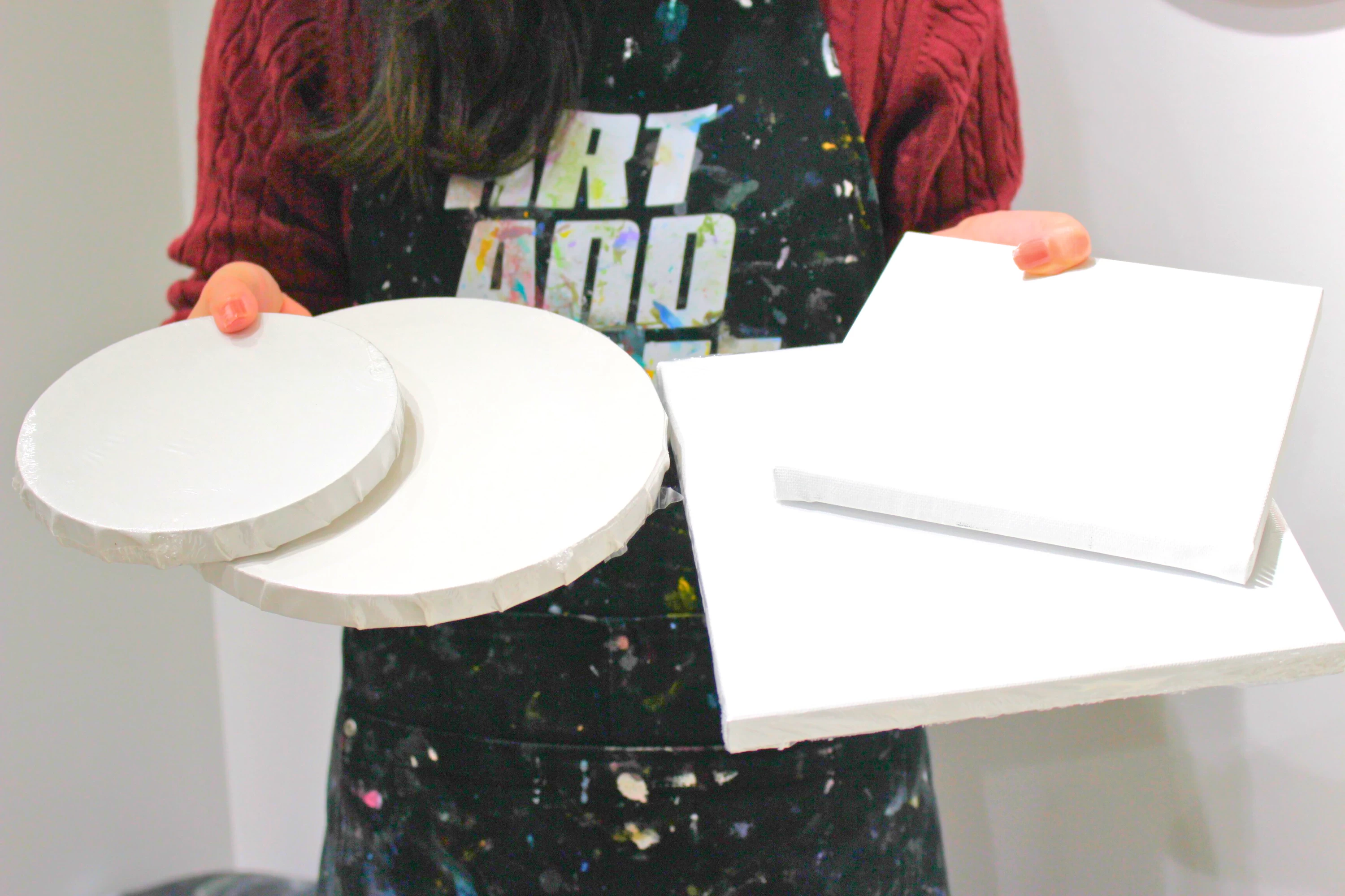 まずは、サイズと形が異なる4種類のキャンバス選びから。今回は一番人気の20cmの丸型にしました。ほかにも、別プランとしてカップルや親子など2人で1つの作品を作るペア向けの大型キャンバス(丸50cmキャンバス、S6キャンバス)も用意されています。