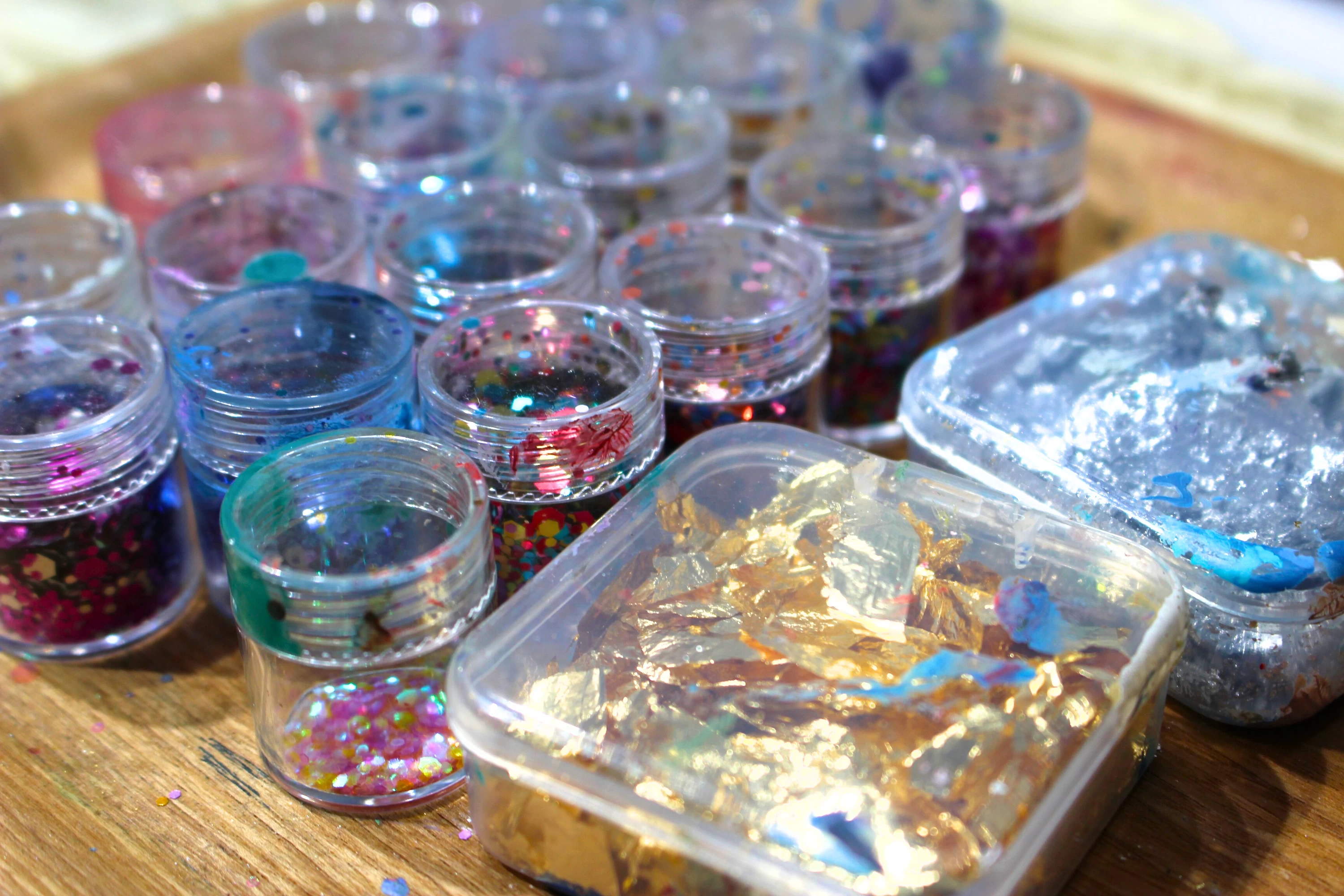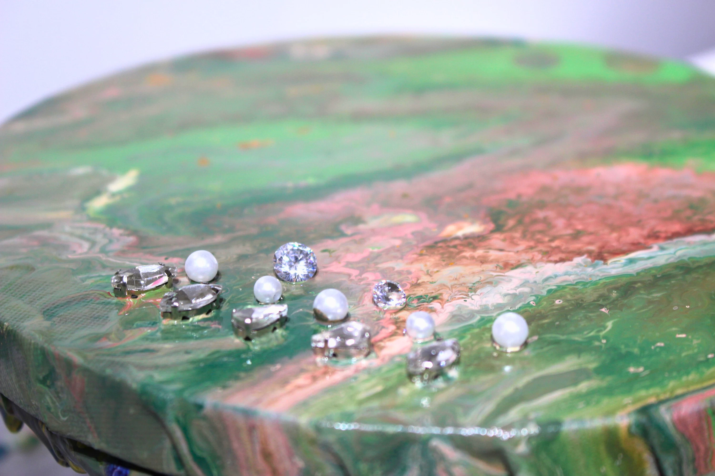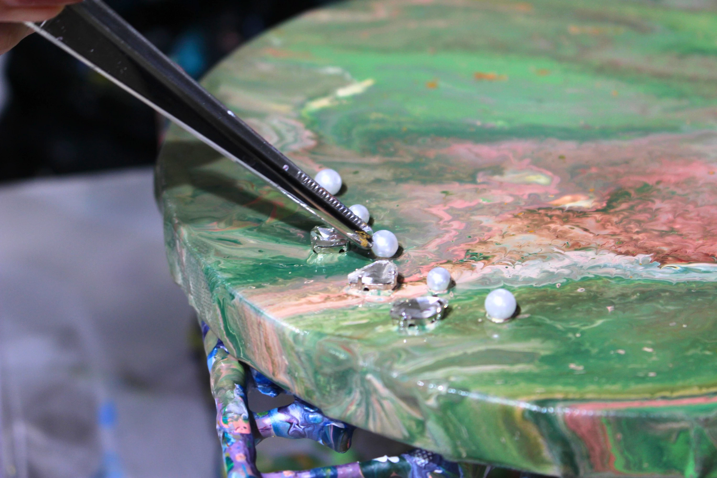 「スワロフスキーたらし込みアート」プランであれば、仕上げにスワロフスキーをあしらえます。たらし込みで生まれた模様の上に配置することで、さりげない輝きがアクセントに。ほかにも、パールや貝殻、金箔・銀箔などが用意されています。模様や色の流れを見て装飾を選べるため、仕上がりのバランスも取りやすい印象でした。控えめな煌めきが加わり、作品全体がぐっと引き締まります。