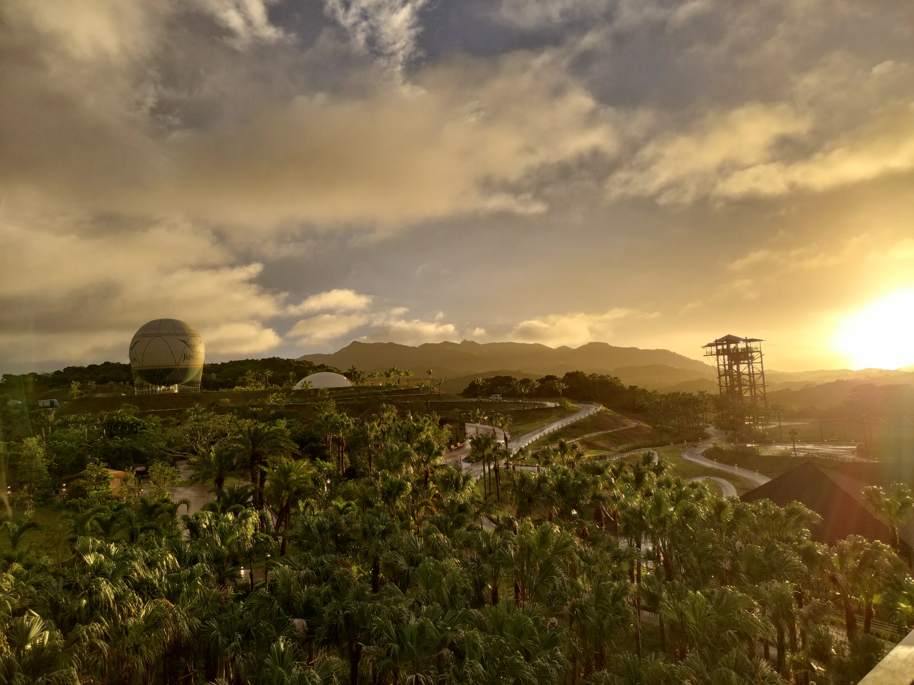 インフィニティテラスからはジャングリア内を見渡せます。パーク内の風景はもちろん、その先に広がる沖縄の山々までが視界に入り、まるでそのすべてが「ジャングリア沖縄」の一部であるかのようなとても壮大な景色が広がります。この眺望は、都心のテーマパークではなかなか体験できません。緑が鮮やかに映え、活力をもらえるような昼間の景色も最高ですが、一番のおすすめは夕方です。夕日の繊細な光が木々を照らし、沖縄だからこそ見られる雄大な景色を見せてくれます。