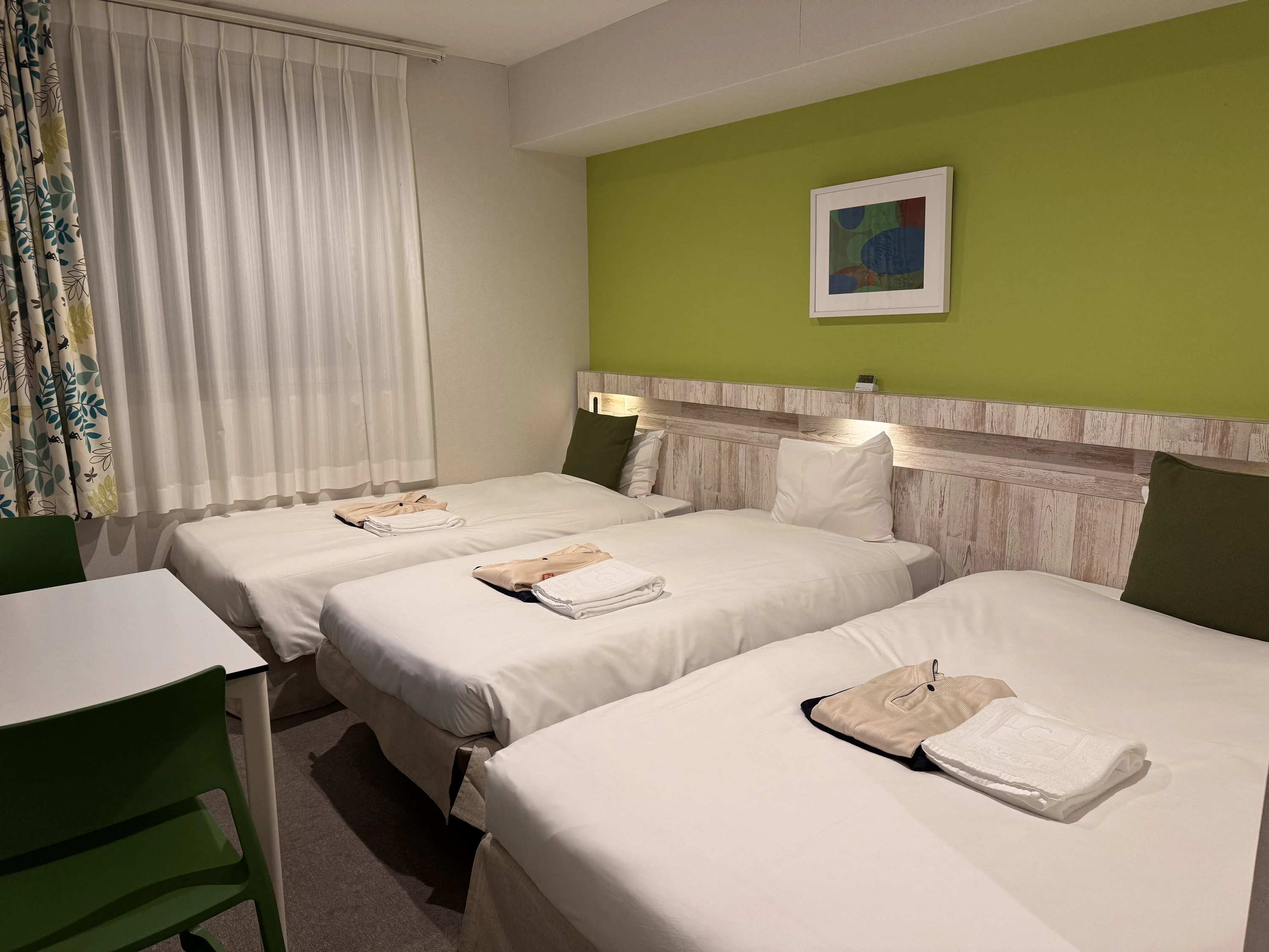 今回私たちが予約したのは、定員2~3名の「モデレートツイン」。 扉を開けると、そこには清潔感あふれる空間が広がっていました。広さは「標準的な2人部屋」といった感じで、決してスイートルームのように広いわけではありませんが、スーツケースを広げるスペースは確保されており、圧迫感はありません。