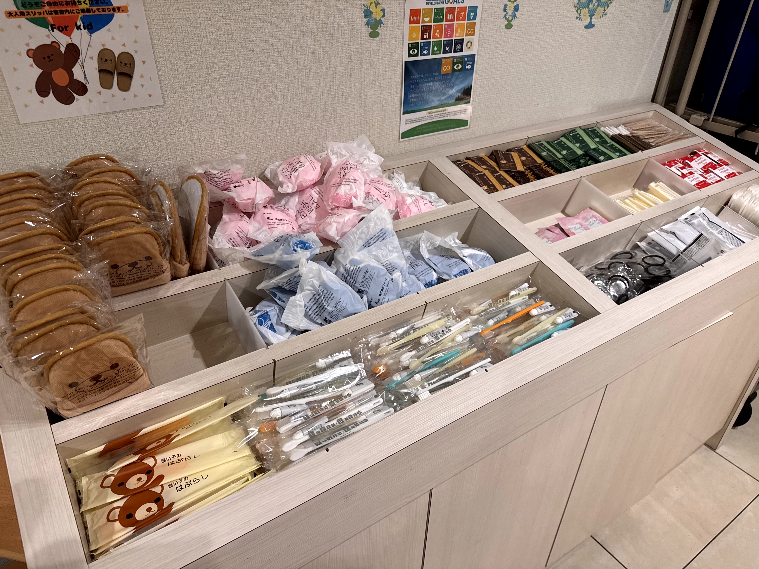 ロビーにあるアメニティーバーには、歯ブラシ、ヘアゴム、ブラシ、コットン、お茶類など、必要なものがずらりと並んでおり、好きなものを自由にピックアップできます。化粧水やクレンジング類もフロントで貰えるので、基礎化粧品を忘れても安心。