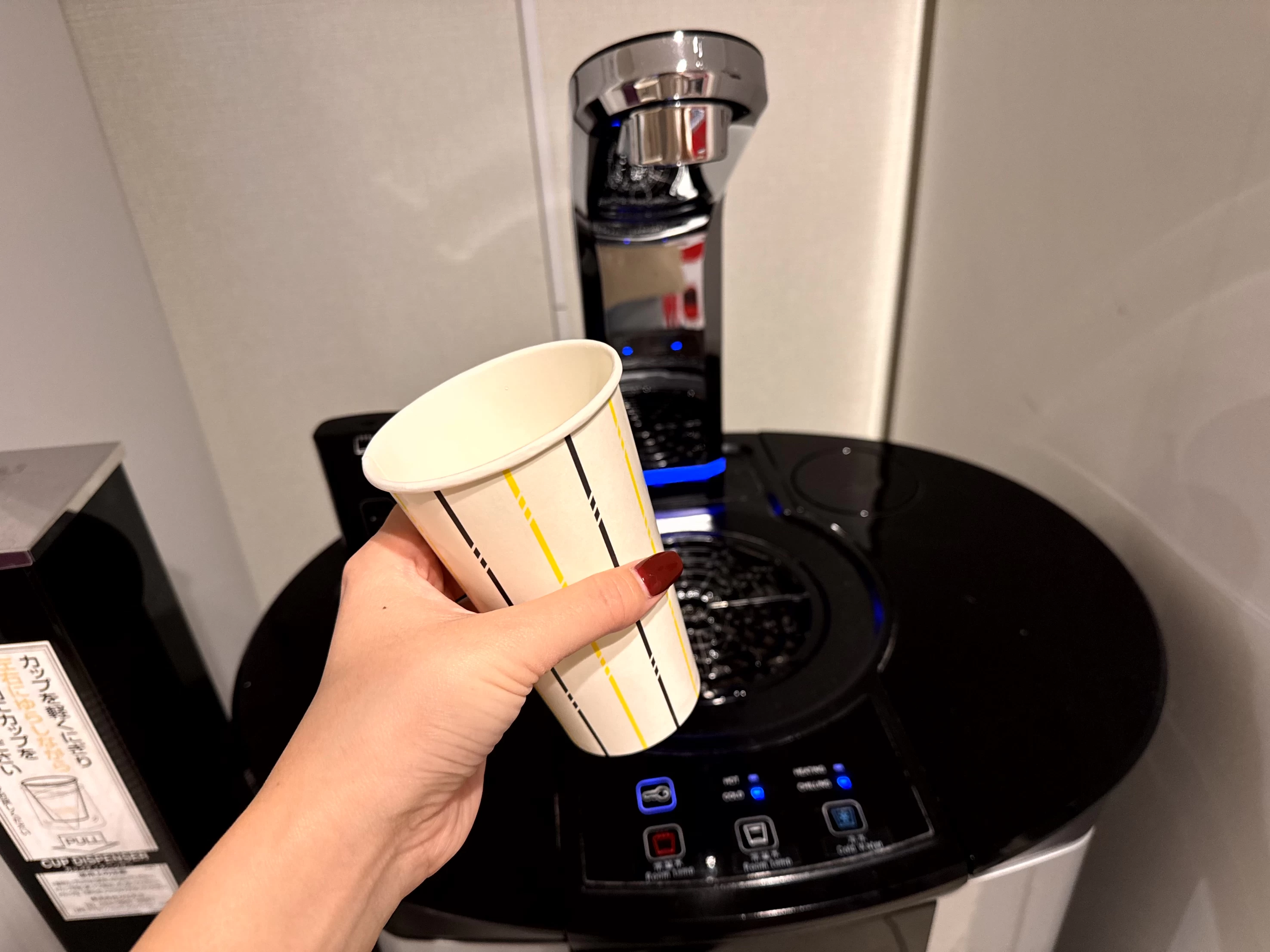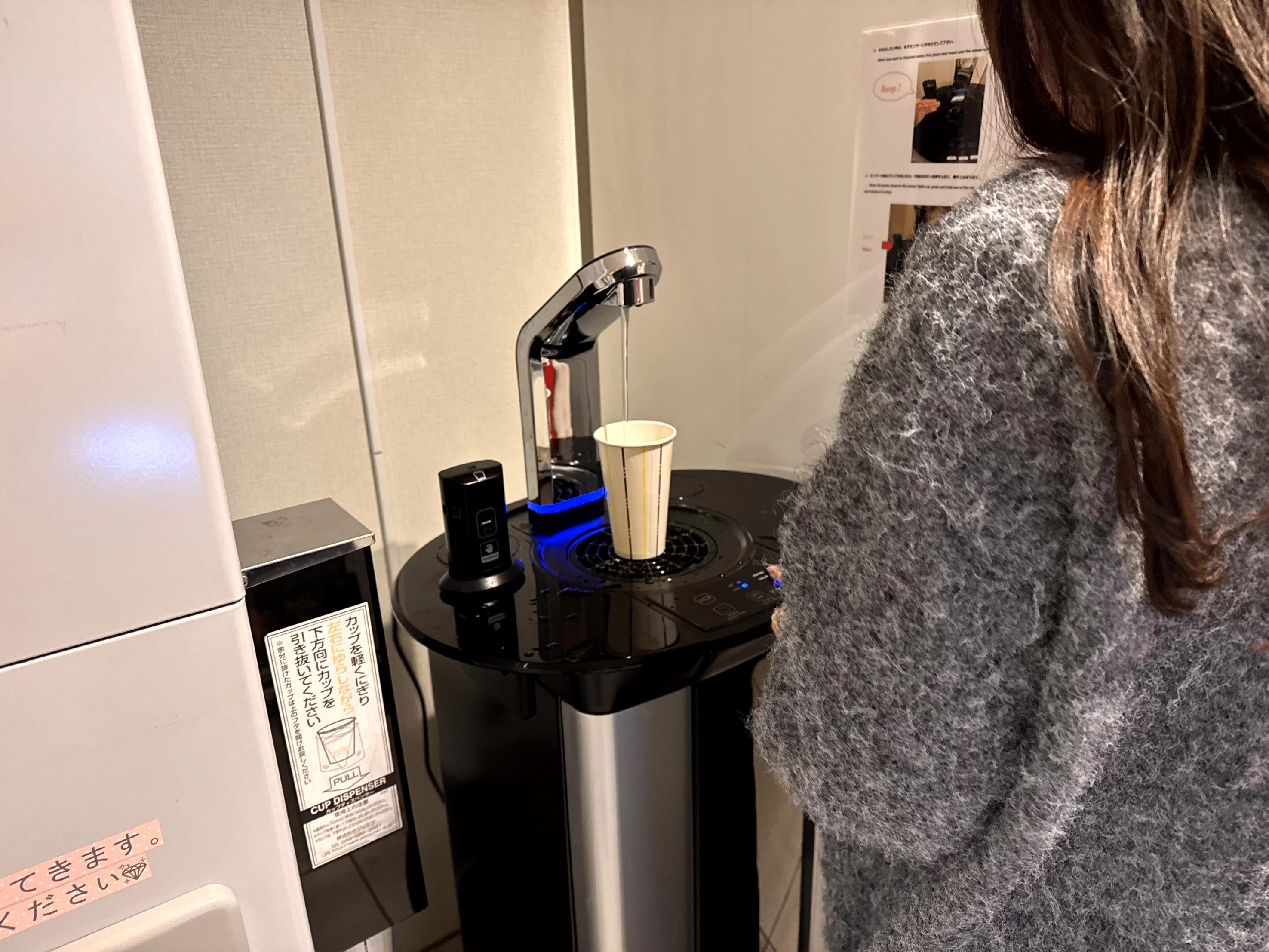このホテルは、1階にウォーターサーバーが設置されています。 部屋には水差し(ピッチャー)が用意されているので、ここで水を汲んで部屋に持ち帰ることができるんです。 お風呂上がりに冷たい水をガブ飲みできる幸せ! 部屋にあるケトルを使えば、すぐにお湯も沸かせます。カップラーメンやモーニングコーヒーも水道水を使わずに作れるのは、精神衛生上、とてもよかったです。
