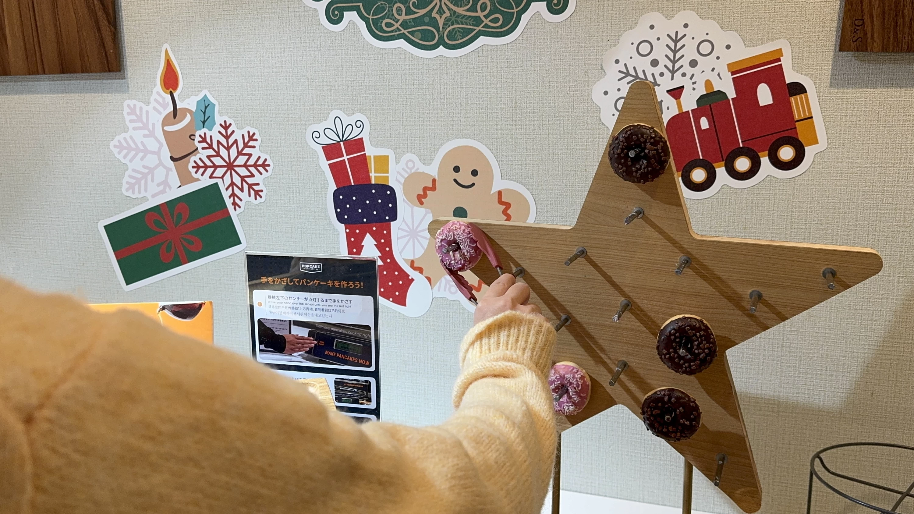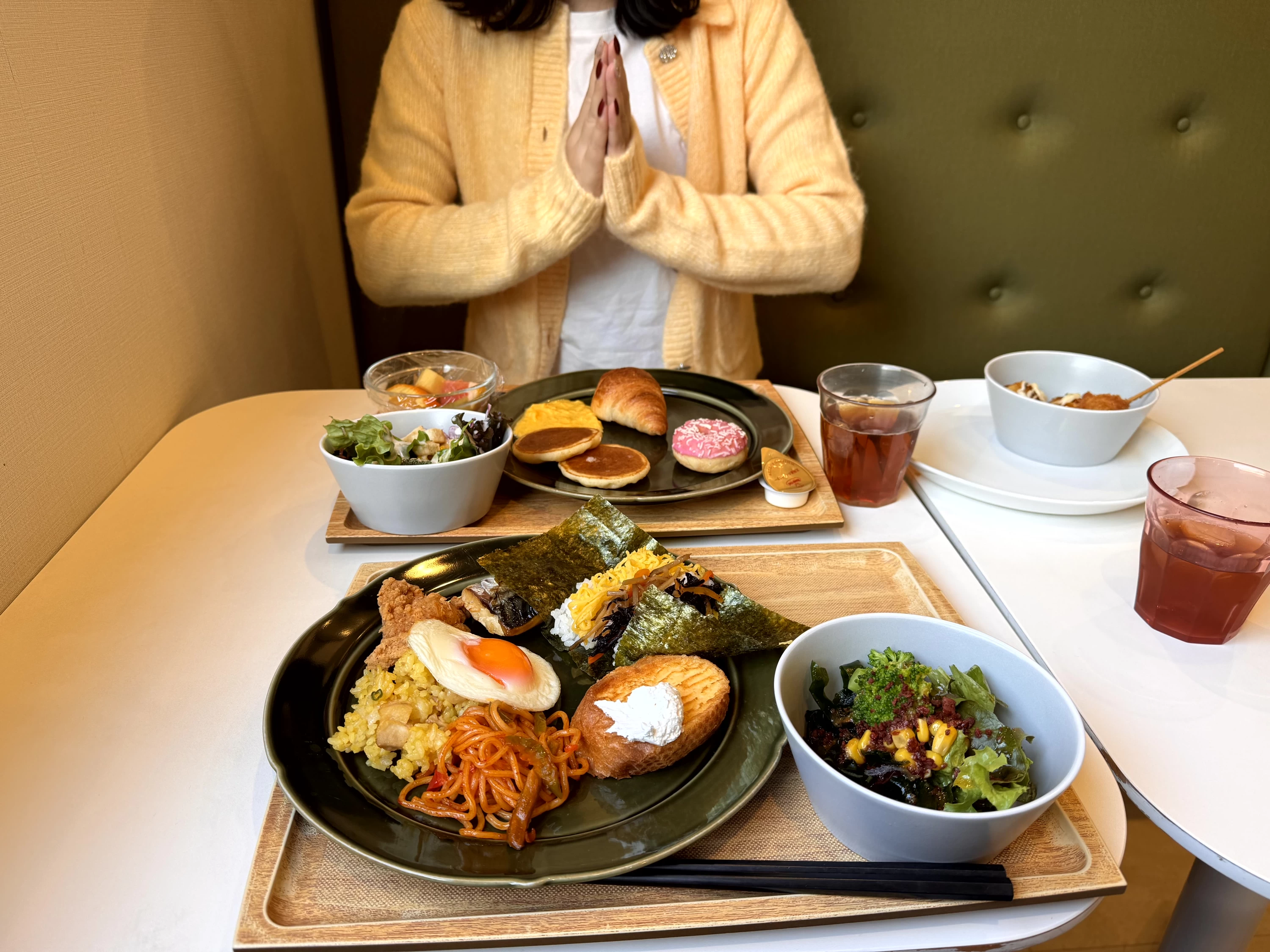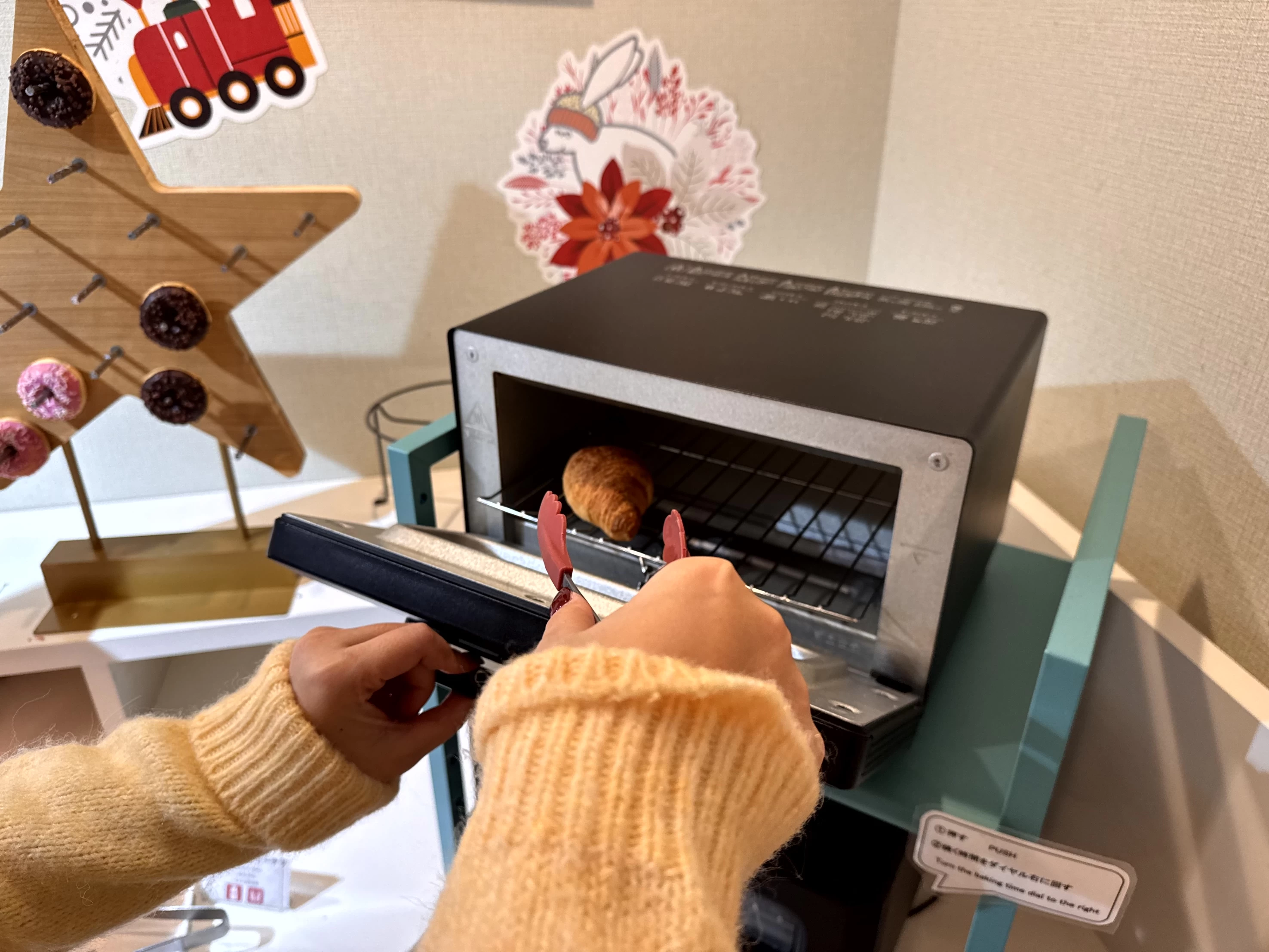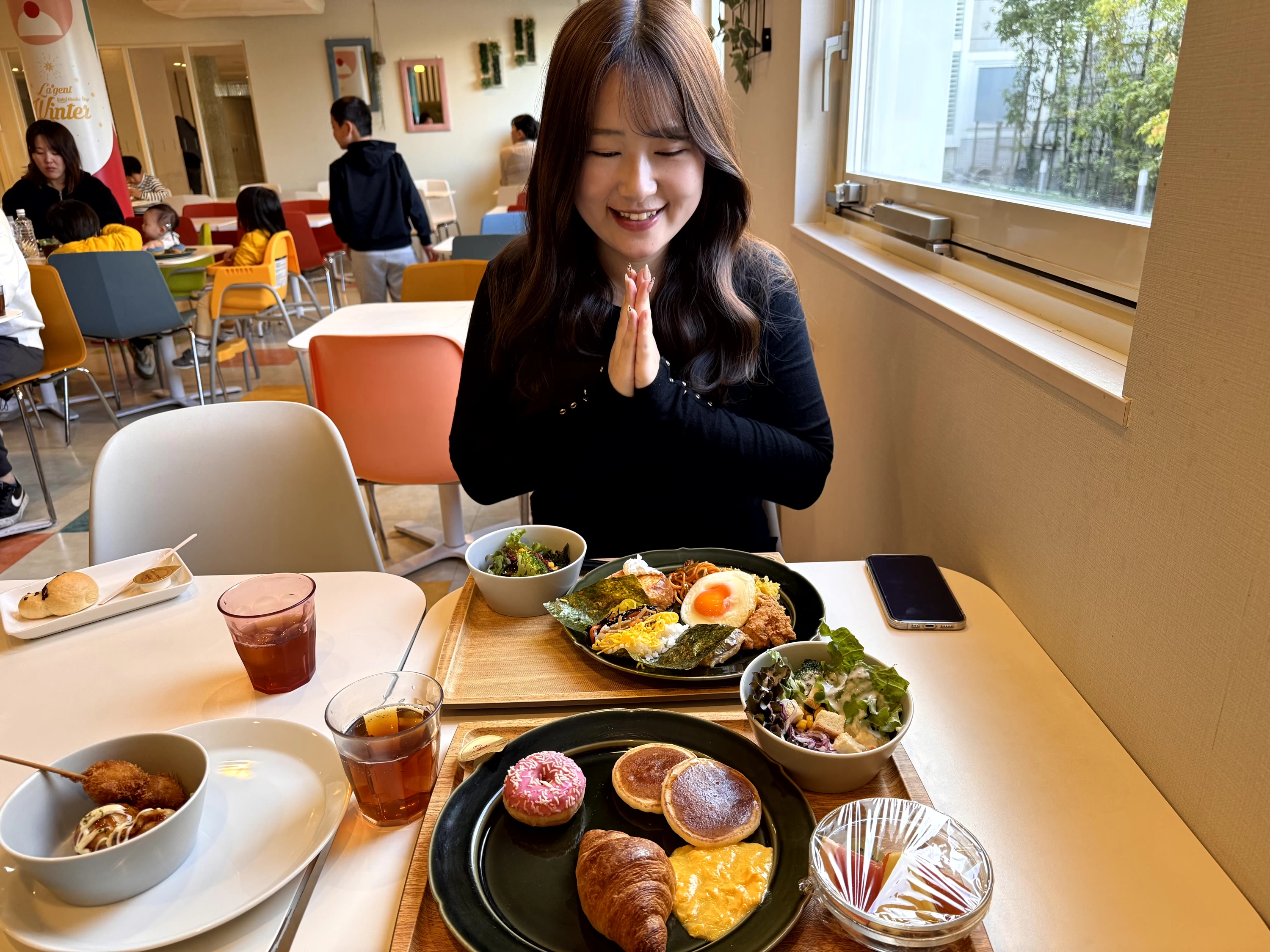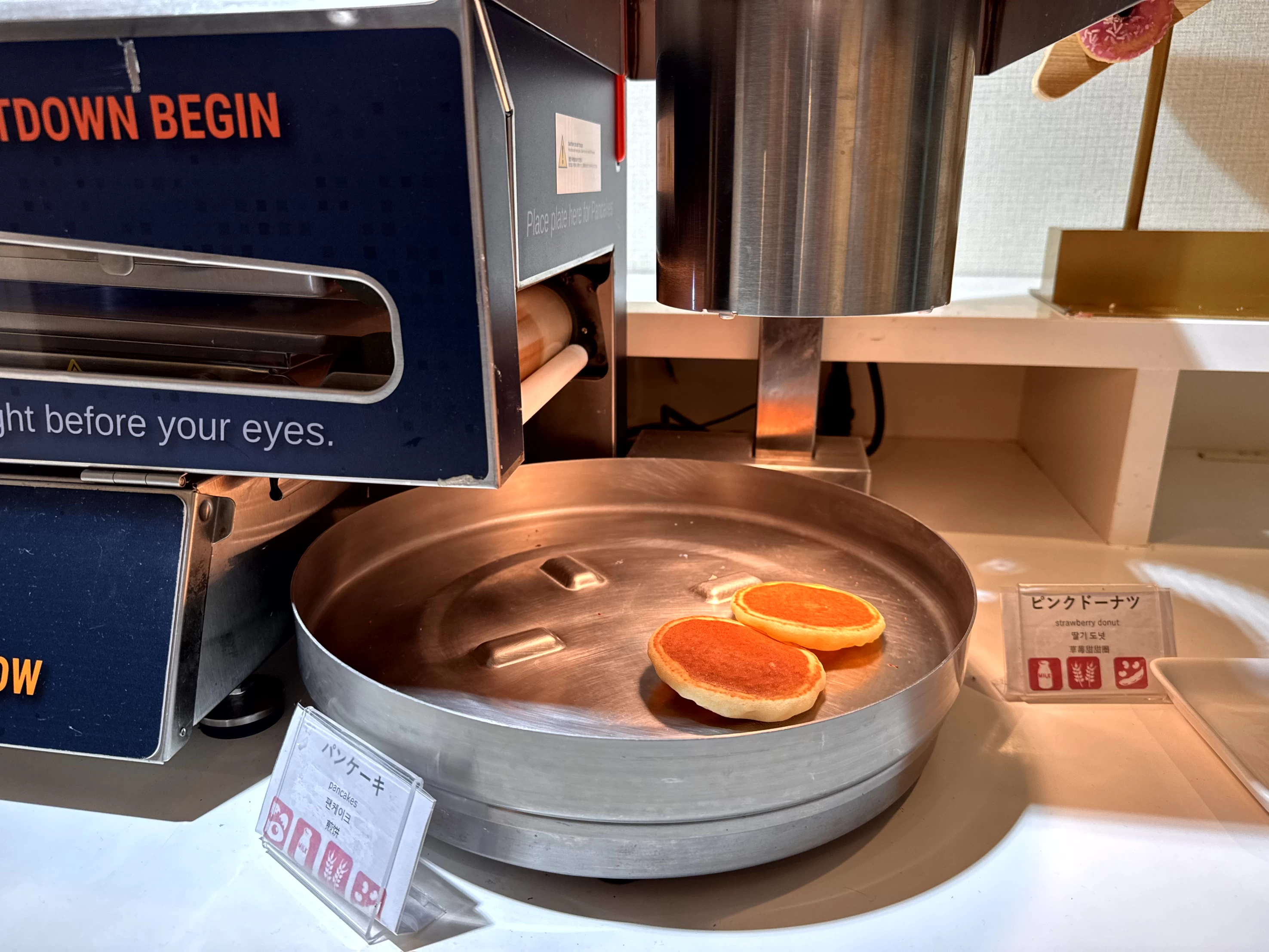 女子的に見逃せないのがデザート&パンコーナー。パンの種類が豊富なのはもちろん、オーブンでリベイクして焼きたてを楽しめます。 そして、子どもたちが群がっていたのが「自分で焼くパンケーキ」コーナー! ボタンを押すと生地が出てきて焼けるマシンがあり、大人の私たちも興味津々で体験しちゃいました。 可愛らしいドーナツもあり、朝からしっかり「映え」も意識されています。
