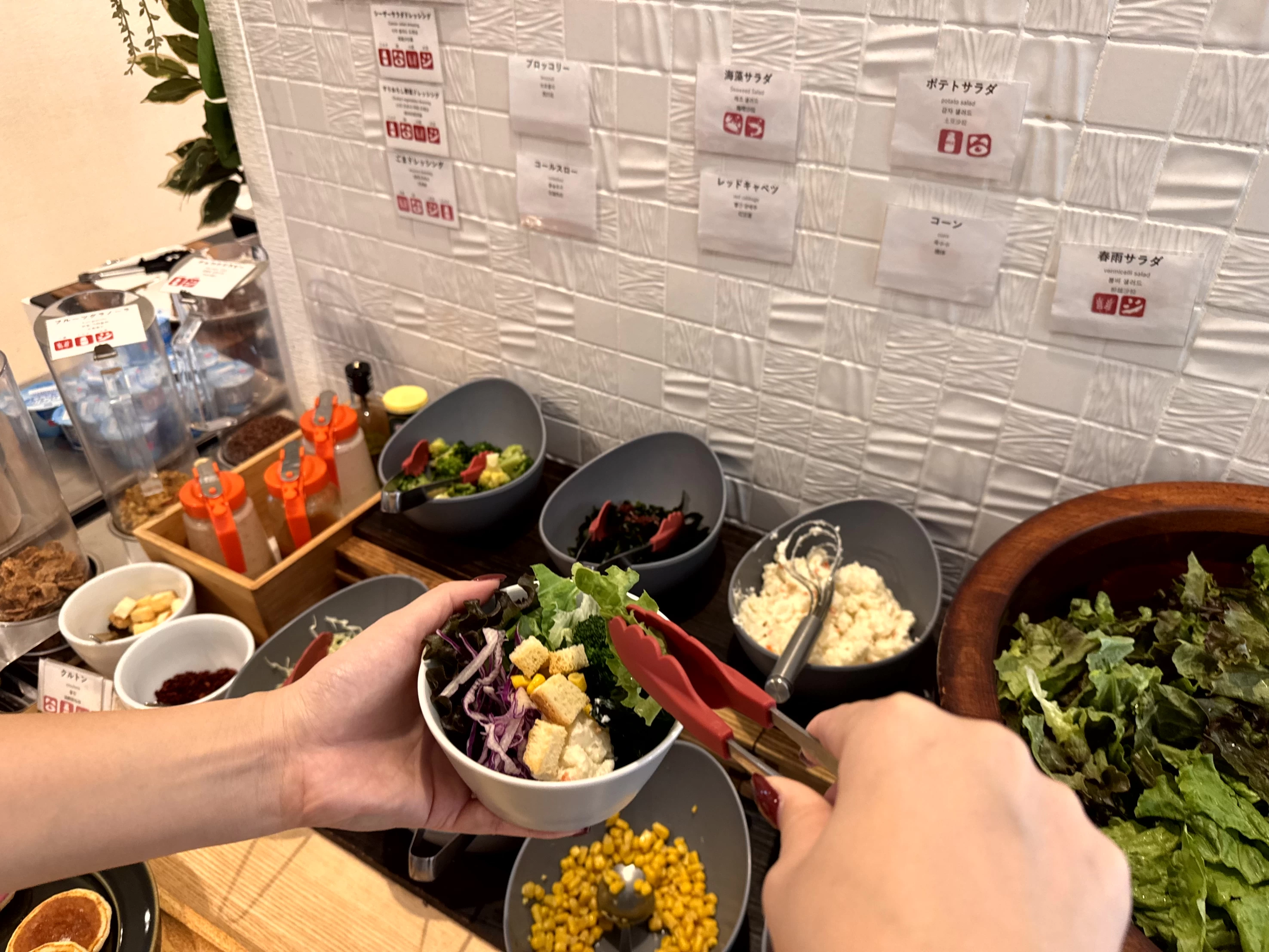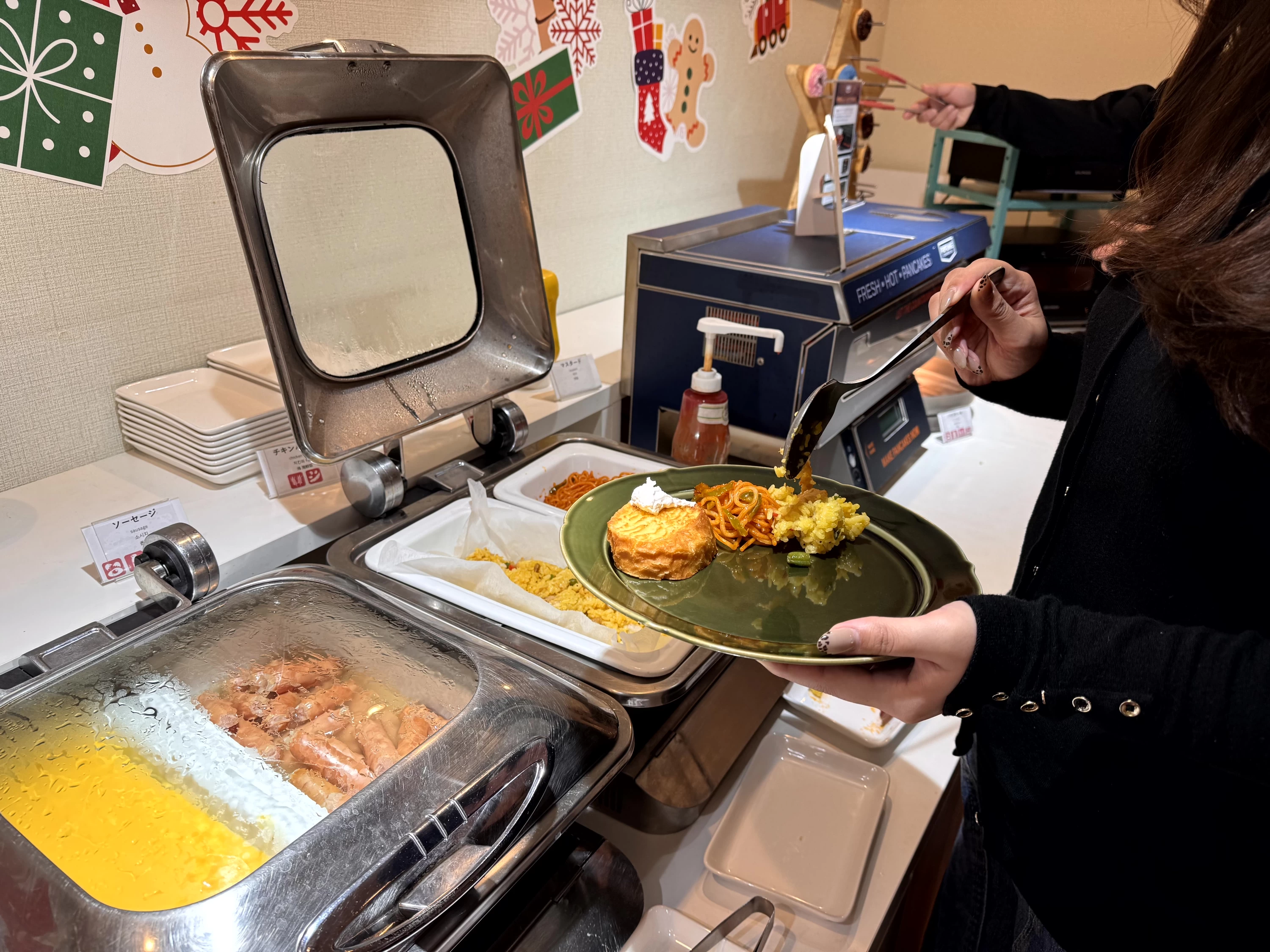 旅行中は炭水化物や揚げ物中心になりがちで、野菜不足が気になっていました。 ここの朝食にはしっかりとしたサラダバーがあり、新鮮な野菜をたっぷり摂ることができました。「自分で巻く手巻き寿司」コーナーなどもあり、栄養バランスを考えながら、好きなものを好きなだけ食べられる。 しっかりエネルギーチャージをして、2日目のユニバへの準備は万端です!