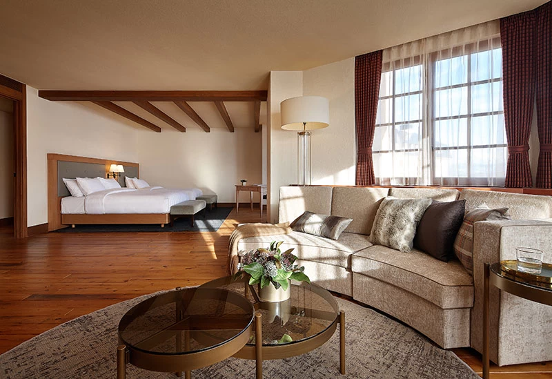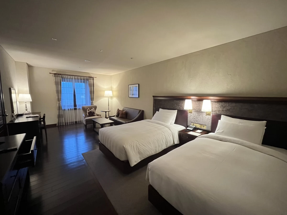 今回泊まったのは「ロッジ棟」のデラックスツイン。40平方メートル以上の広さがあって、ベッド2台にソファも設置され、すごくゆったりとした客室です。上質な木材や塗り壁が温かみを演出していて、まるでヨーロッパの山荘にいるような雰囲気。高級感がありながらも落ち着いた空間が広がり、リラックスして過ごすことができます。テーブルもあるので、ちょっとした作業にも便利です。