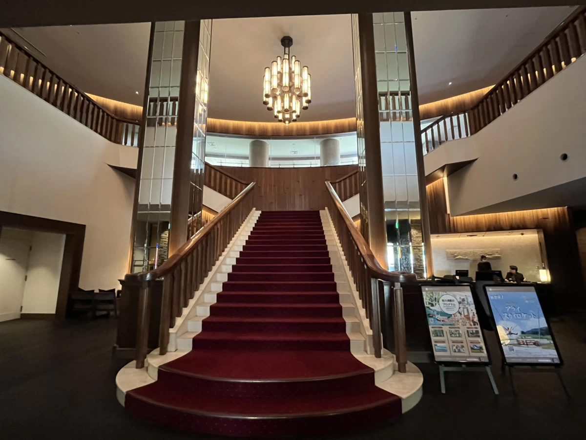 レセプションは「ロッジ棟」と「アライ棟」の2カ所にありますが、今回は「ロッジ棟」を利用しました。地下1階にあり、1階まで続くレッドカーペットが敷かれた豪華な階段が、まず目に入ってきます。