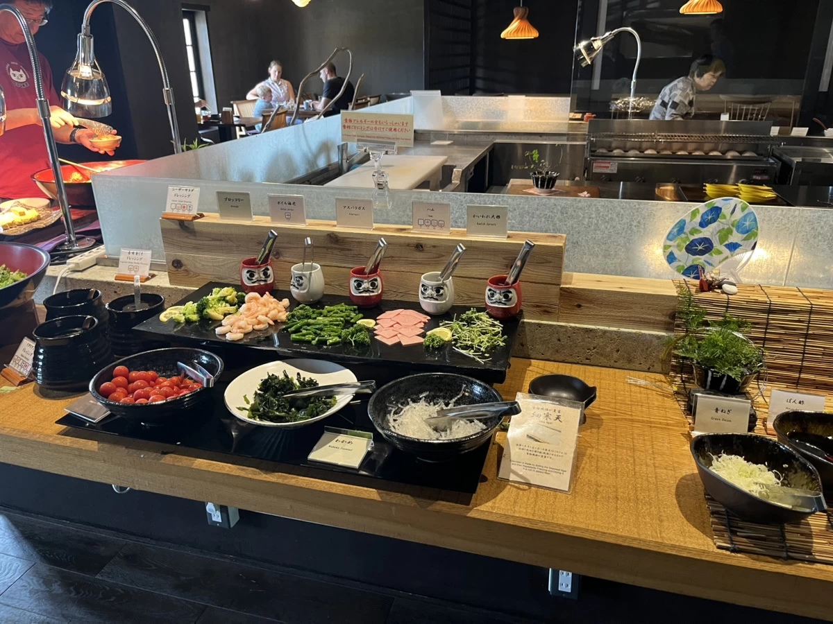 そのほかにも、地元食材を使ったおかずや手作り豆腐、オープンキッチンのオムレツ、パンなどもあり、朝からしっかりお腹が満たされました。