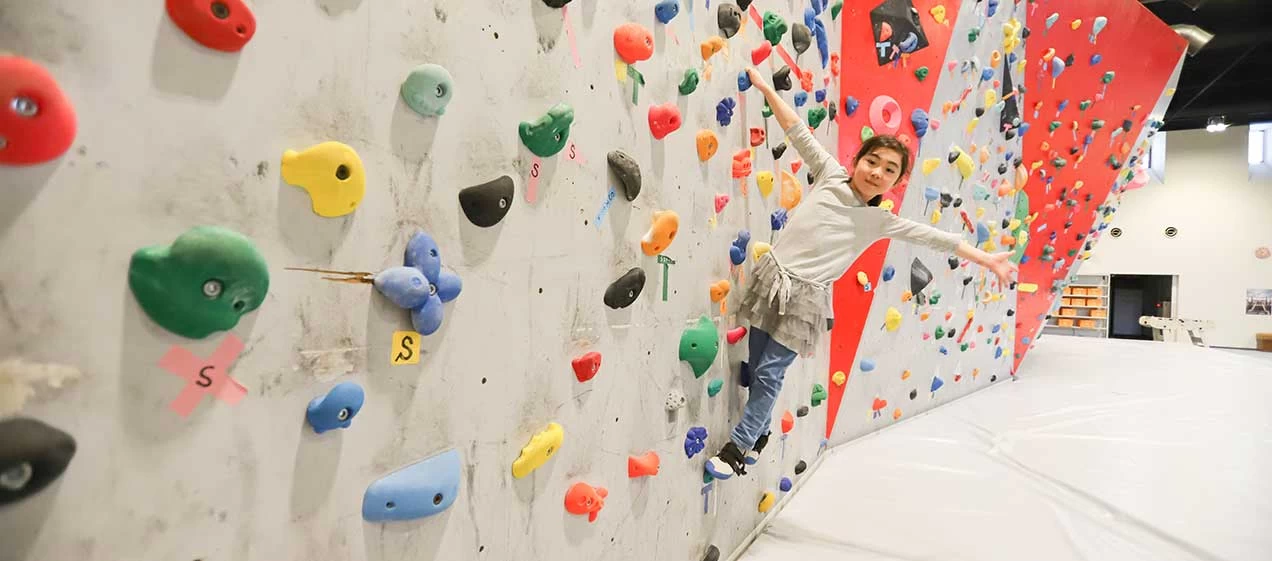 高さ4.5mの日本最大級ボルダリングウォールは、初級から上級まで多彩なルートを用意。シューズレンタルもあるので手ぶらで気軽に挑戦できます。