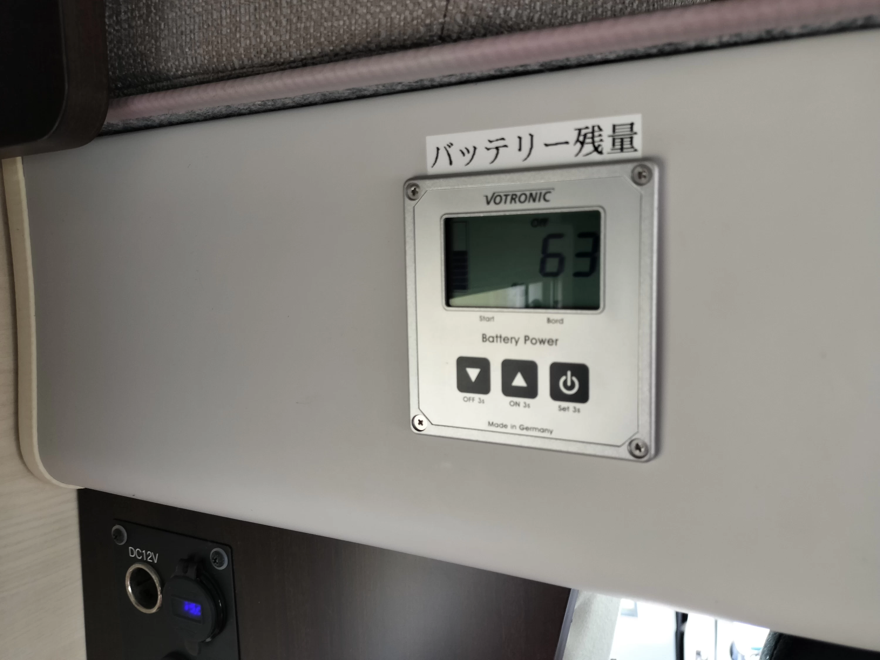 車内のバッテリーはここで残量確認できます。写真では63%となっていますが、走ればバッテリーは減るのではなく、増えていきます。十分に溜まっている状態であれば、エアコンを使用して一晩過ごすことも可能です。