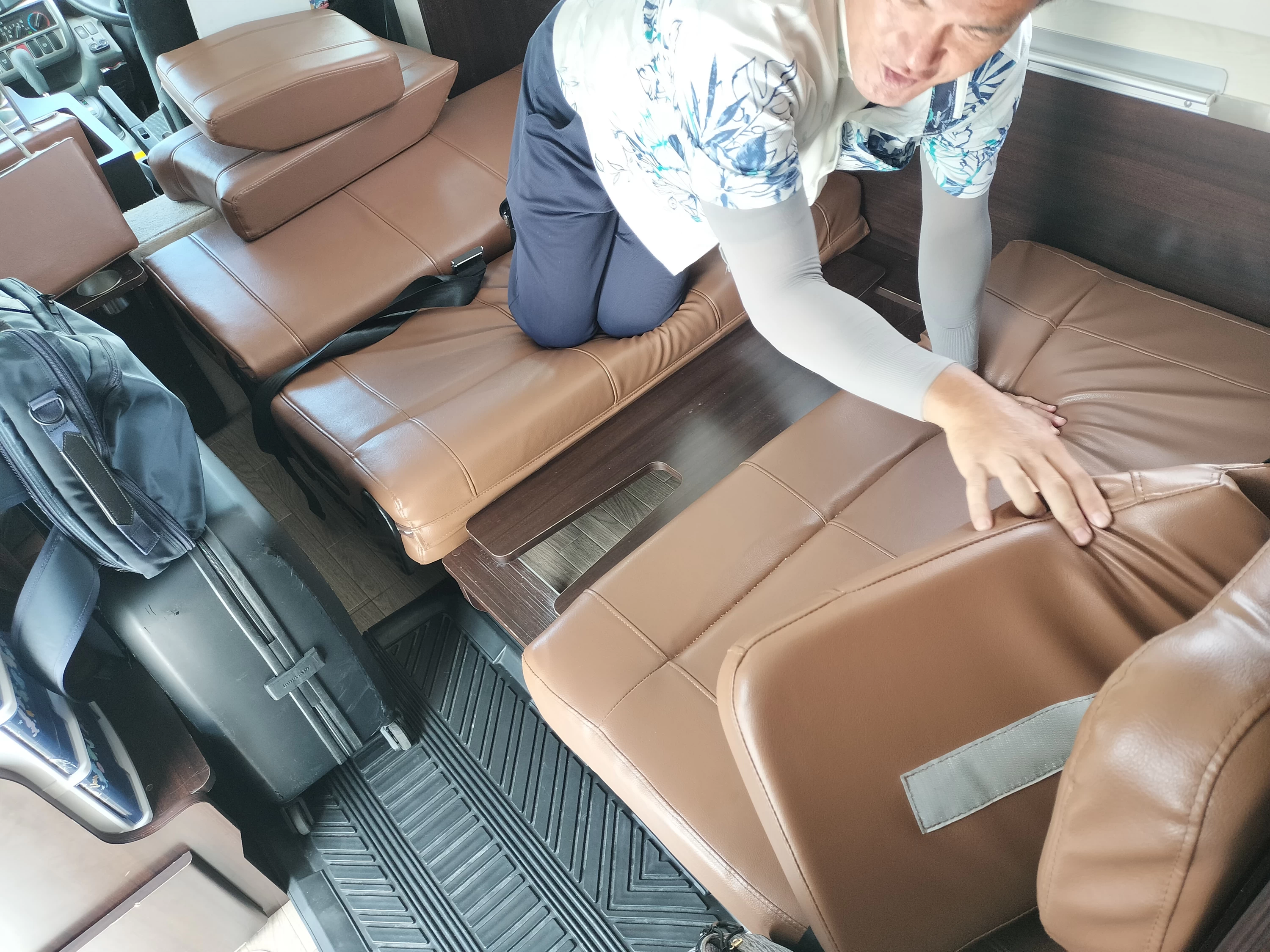 テーブルも設置でき、それを囲むように「対面対座」や「L型ラウンジ」にシートを変更できます。これなら会話もしやすいですよね。椅子もフカフカで、移動の合間の休憩もできちゃいますね。(移動中は、安全のためテーブルを収納することをおすすめします)