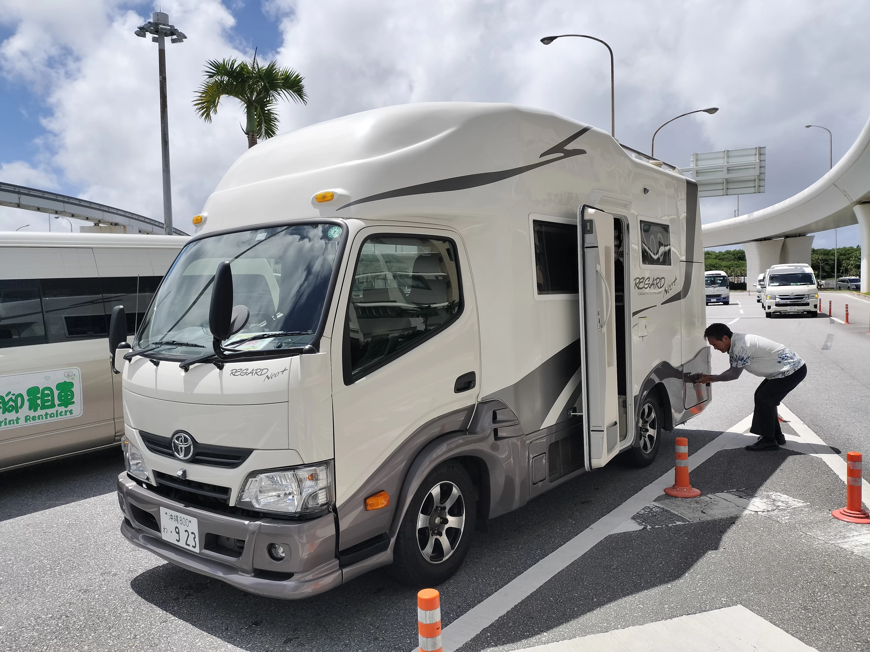 まずはスタッフがキャンピングカーで空港まで迎えに来てくれます。今回は、夏休み突入直後の沖縄とあって、空港は大混雑。レンタカーを待つ人がズラリと並んでいましたが、キャンピングカーは車高が高いので、すぐに見つられました! 那覇空港では駐車ができないため、すぐに乗り込んで移動開始。レンタカーの詳しい説明は、このあと。