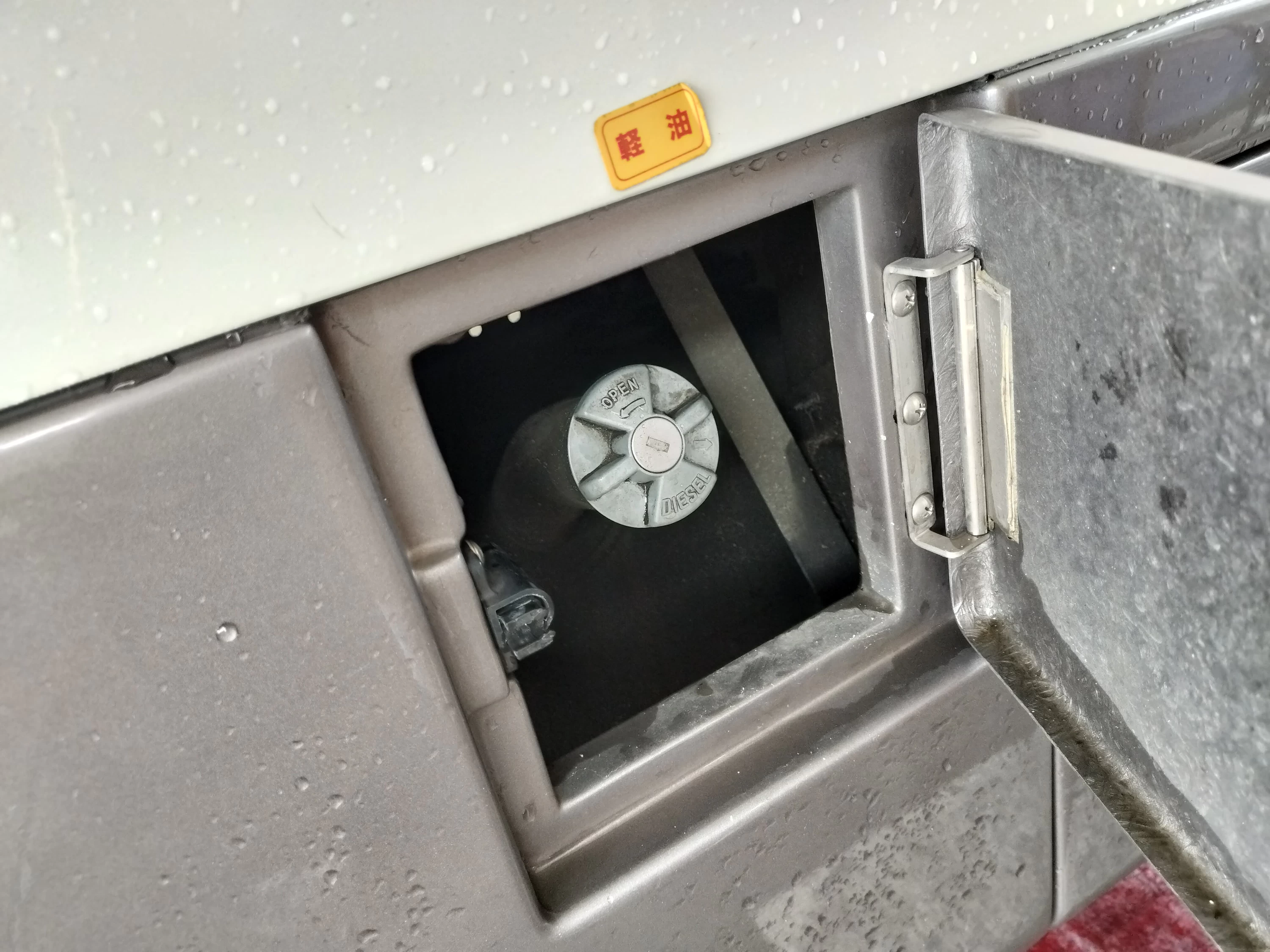 写真のように給油口の扉を空けると普段馴染みのない形状が表れます。真ん中部分に鍵を差し込み、回すと給油口が開きます。説明を受けたものの、いざ給油するとなると初めて見る形状に少し戸惑いました。