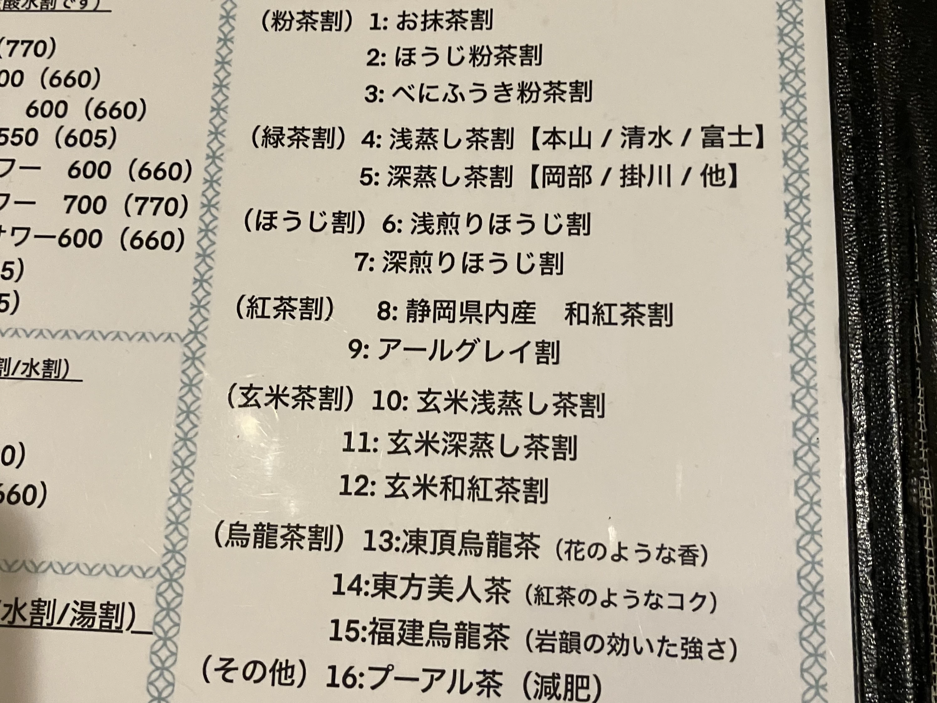 ふたつ目はお茶割。なんとお茶割りのメニューがたくさんあるんです。浅蒸し、深蒸し、ほうじ茶…と、お茶の種類がずらり。こんなにお茶割りで真剣に悩んだのは初めてです。悩んだ末に「浅蒸し茶割」をチョイス。驚くほどすっきりとした味わいで、美味しいお茶で割っているからか、お酒を飲んでいる罪悪感がどこかへ消えてしまそうでした。いくらでも飲めてしまいそうでこれは危険ですね!