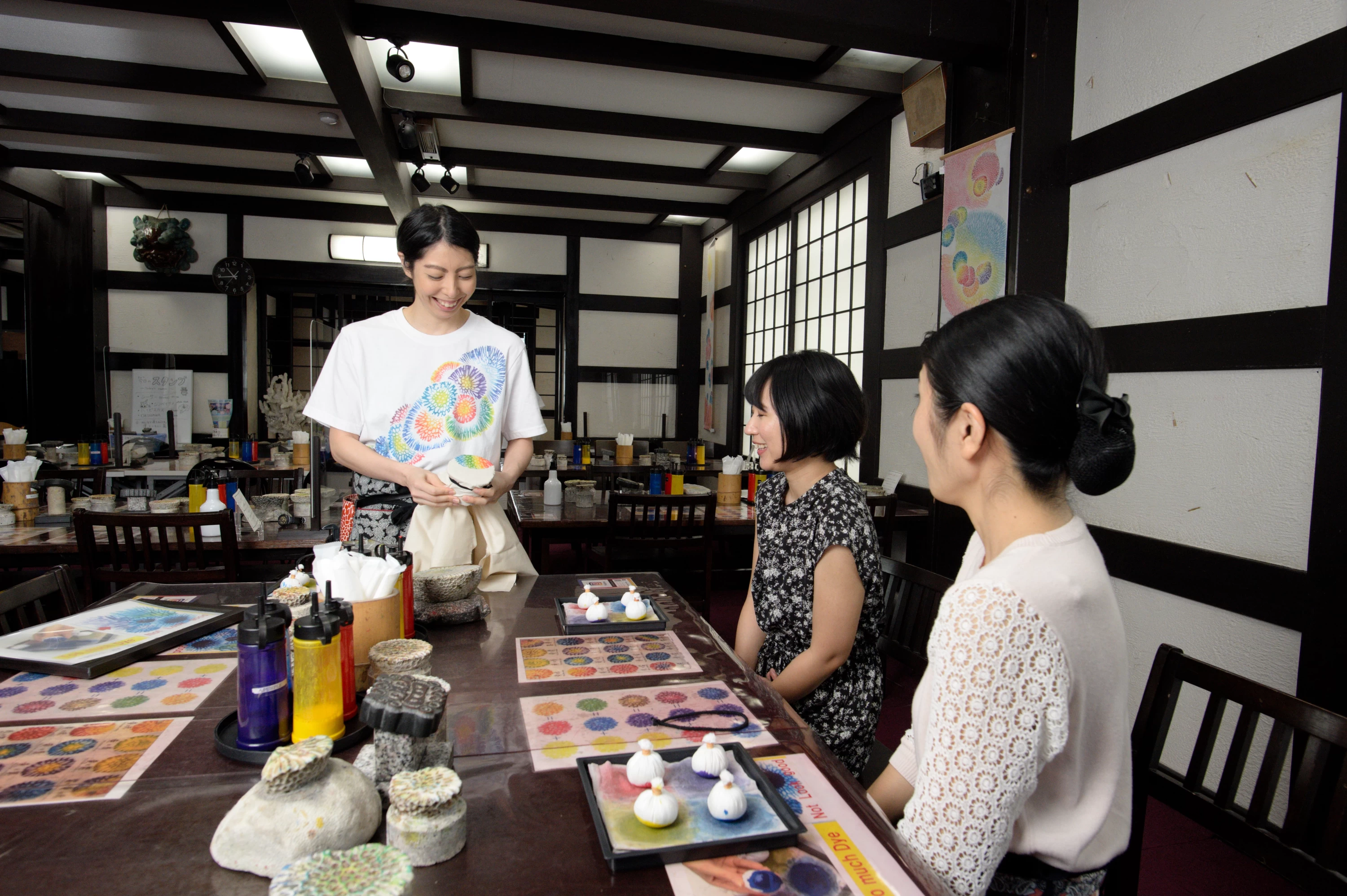 体験に使用する道具は3つだけ。「染料」「タンポ」「サンゴの化石」のみ。これらを使用し、思い思いに染めていきます。どのように染めていくかは体験者が決めてよいため、世界にひとつだけの、オリジナル作品に仕上がります。
