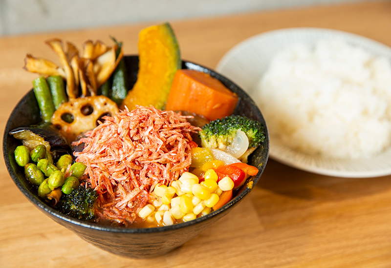 ベースは「東京スープカレー」のなかでも「山盛り小海老 東京スープカレー」(通常980円、ランチ880円)を選択。野菜は14種(+360円)、辛さとごはんの量は普通、トッピングは小籠包1つとむきエビ2尾の「小籠包エビセット」(+280円)をセレクト。欲望のままに頼みつつも、野菜はマックス、トッピングは揚げ物を避けました。食べ応えは抜群ですが、エビのうまみが溶け込んだスープはさっぱりでカロリー控えめ。なんといっても出汁のように奥深いうまみのあるスープはどんなトッピングも受け止める懐の広さを持っています。