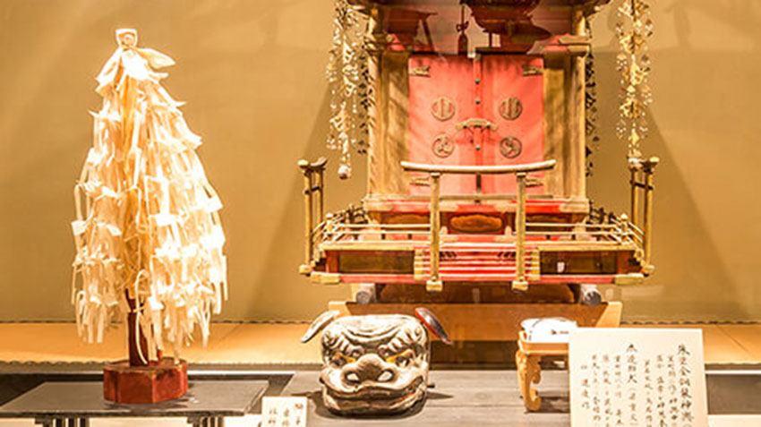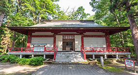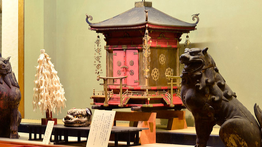 - 宝物殿には国指定重要文化財の「朱漆金銅装神輿」や県指定重要文化財の「木造狛犬一対」など、社宝や祭典器具類を展示している。