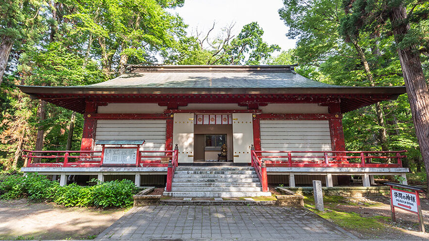 社宝が収められている宝物殿は、参拝の際にぜひ訪れたい見どころのひとつ。なかでも国の重要文化財に指定されている「朱漆金銅装神輿」は、祭典の華やかさと神事の重みを今に伝える格式の高い宝物だ。室町時代に製作されたもので、朱の漆が塗られた木地に華やかな金銅の金具が打たれた芸術性の高さは必見。また、県の重要文化財に指定されている「木造狛犬一対」は南北朝時代に作られたと推定されており、高さ約97cmで寄木造に漆仕上げの精密な造形が、神域の守護を象徴している。さらに、国の重要無形民俗文化財に指定されている「会津の御田植祭」の祭具類や、歴代藩主にまつわる社宝などが揃い、当地の歴史と祭礼の息吹を感じることのできる空間となっている。宝物殿の拝観は9~16時。