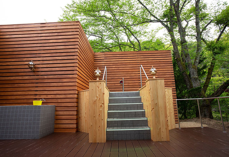 間仕切りされた空間は、熱波と向き合うのに打って付け。備え付けのTVにも、たき火や川のせせらぎなどの映像が流れており、“サ活”に集中できる。体を十分に温め、水風呂に入ったあとは、神々が集う出雲の大自然に包まれて、贅沢な外気浴を堪能しよう。