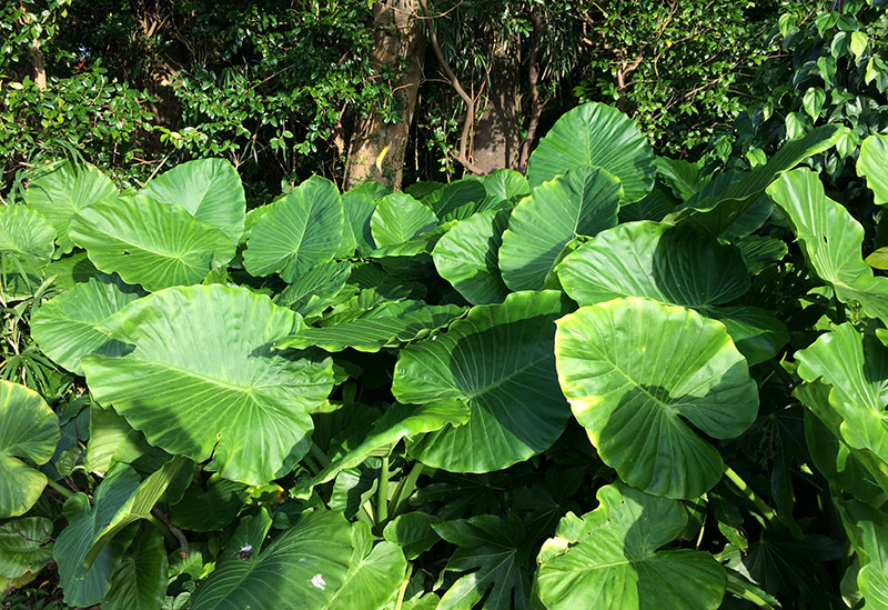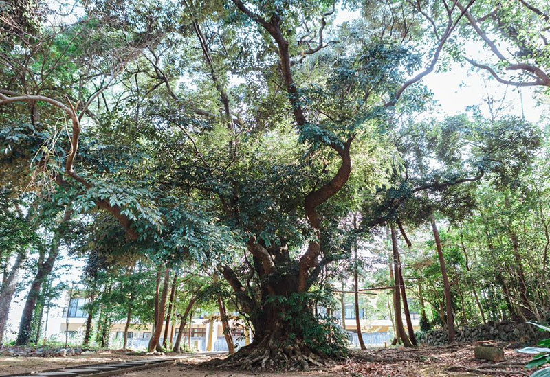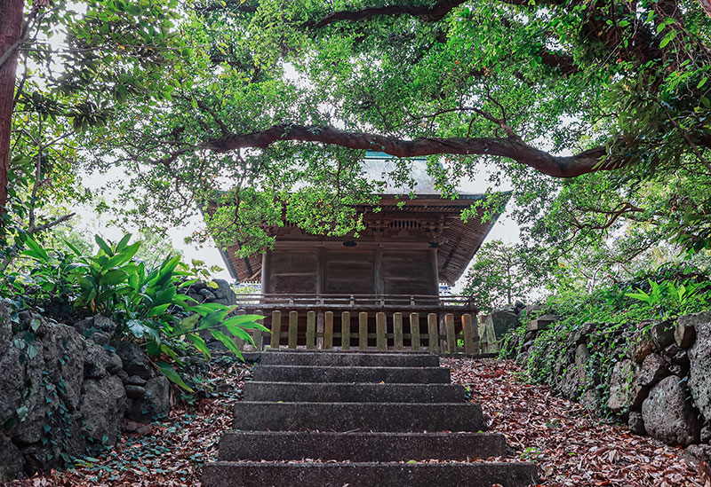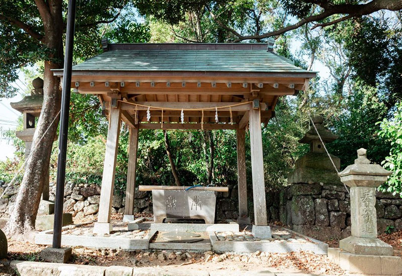 多くの木々で囲まれた神社の鎮守の森では、“出世芋”と呼ばれる多年草のクワズイモが自生しており、五島市の天然記念物に指定されている。里芋に似ているが、毒性があるので食べることはできない。縁起が良い植物として知られ、観葉植物としてもお馴染みだ。