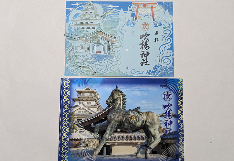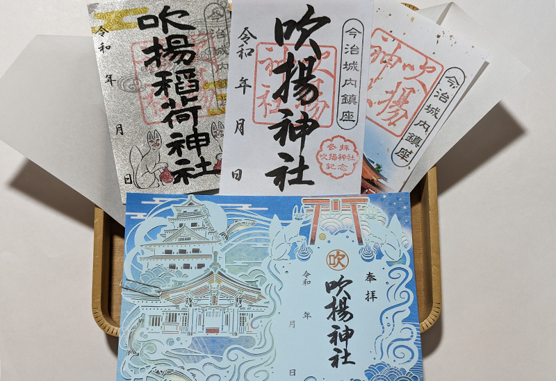 社務所にて頒布される切り絵御朱印は、瀬戸内海をイメージするブルーで「吹揚神社」と「今治城」をあしらい、魚の絵柄をアクセントにした可愛らしいデザインが好評。ほかにも3種類の御朱印があり、今治城観光や参拝のあとは、ぜひ立ち寄って授かりたい。