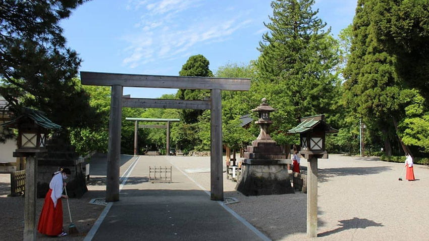 神社は、加賀藩初代藩主・前田利長公が築いた高岡城の城跡「高岡古城公園」の中央に位置する本丸跡に鎮座。現在の社殿は、建築界で初めて文化勲章を受けた伊東忠太氏が設計を、加賀藩の御用を勤めて松井建設を設立した松井組の松井角平氏が施工を担当した。また、銅板巻き神明型の大鳥居と、伊勢の神宮から特別に譲り受けた第一鳥居(神明鳥居)が立つ。