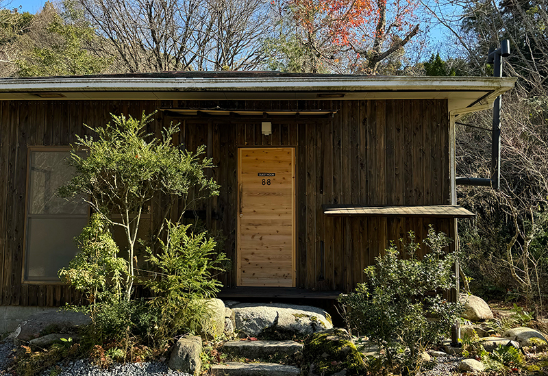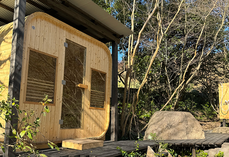 森の中に設けたフィンランド式プライベートサウナは、セルフロウリュができるので好みの温度で楽しめる。外は水風呂を備えプライベートな空間で、昼は美しい日本庭園で森林浴、夜は星空を眺めながら外気浴を満喫して“ととのう”体験はおすすめ(7名まで)。
