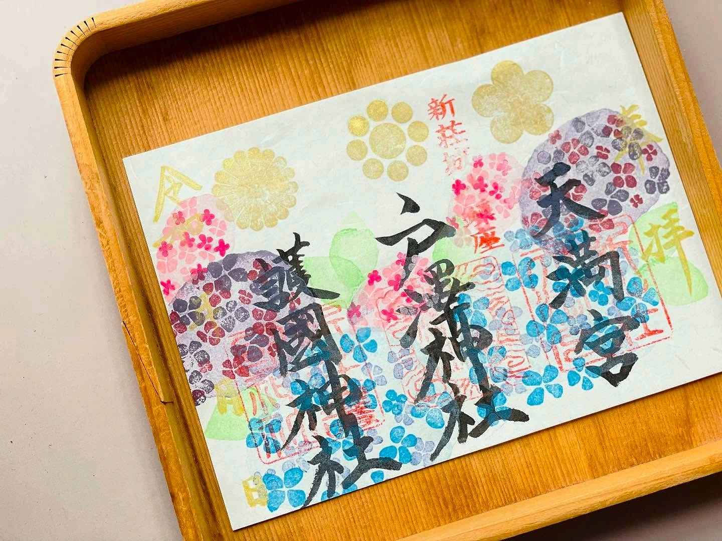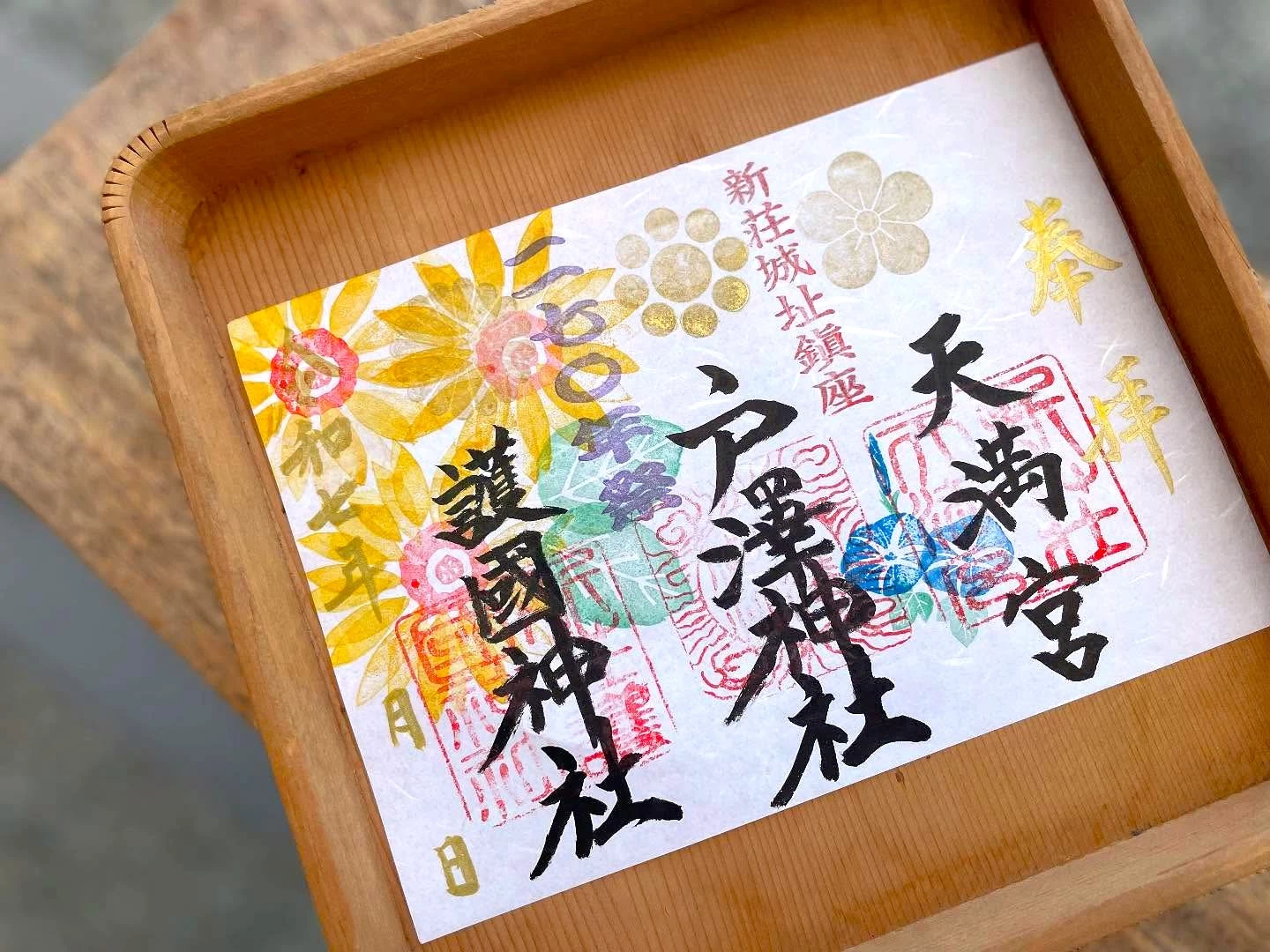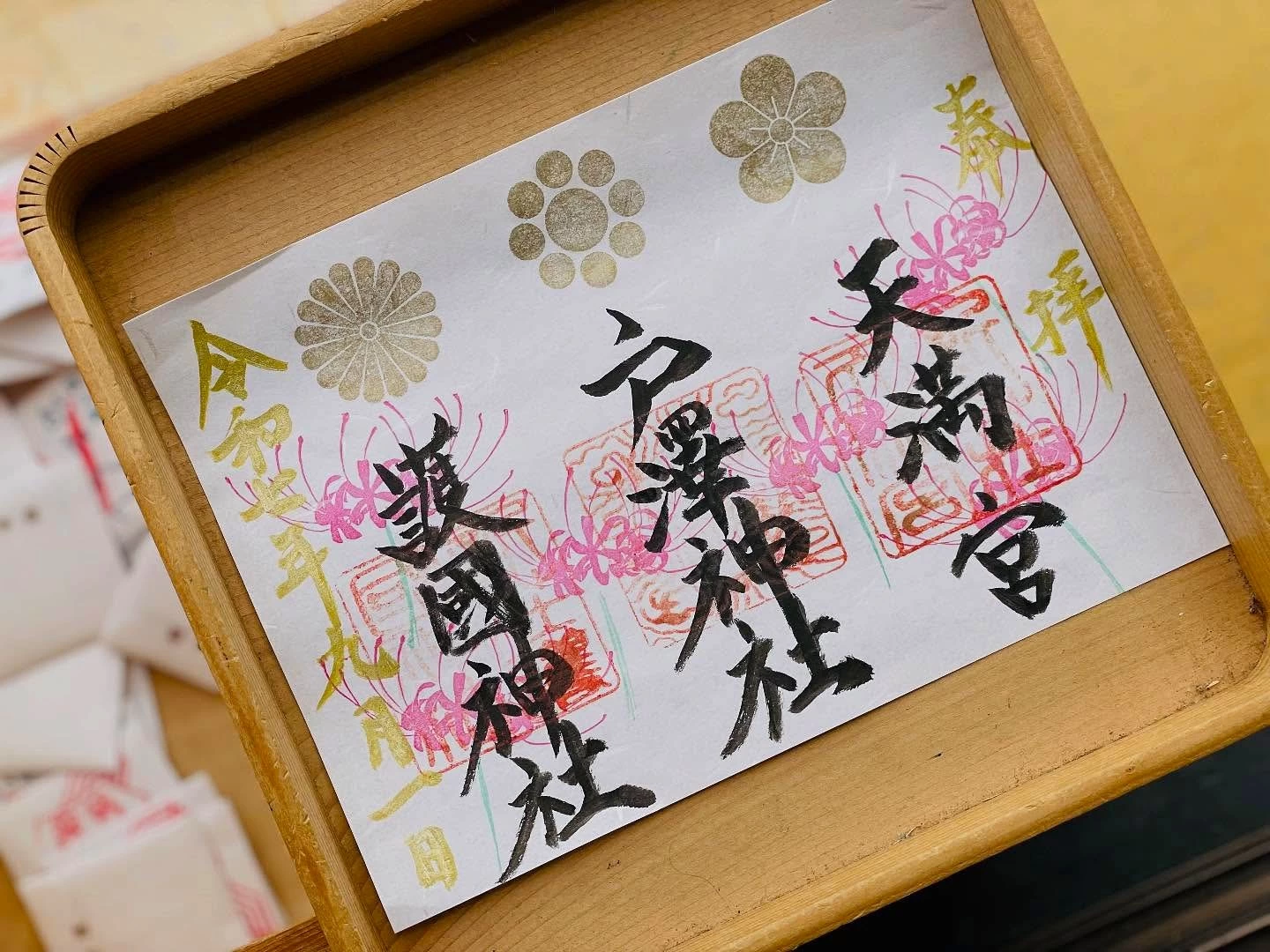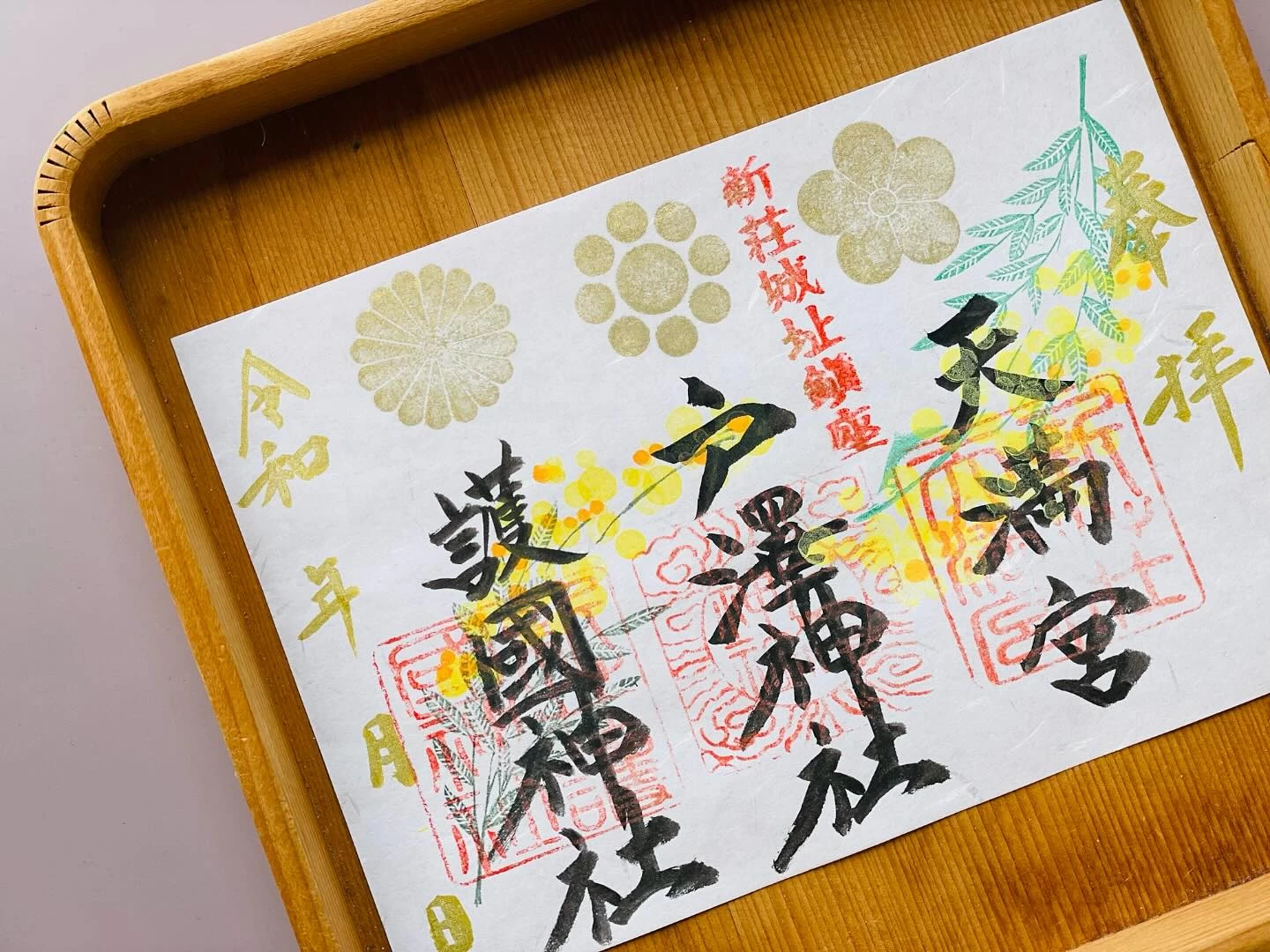 手彫りの印など創造的なデザインの御朱印が頒布されている。境内をともにする3社を見開きにまとめためずらしい御朱印や、月、年、季節ごとの御朱印、期間限定のものなど種類豊富。御城印もある。