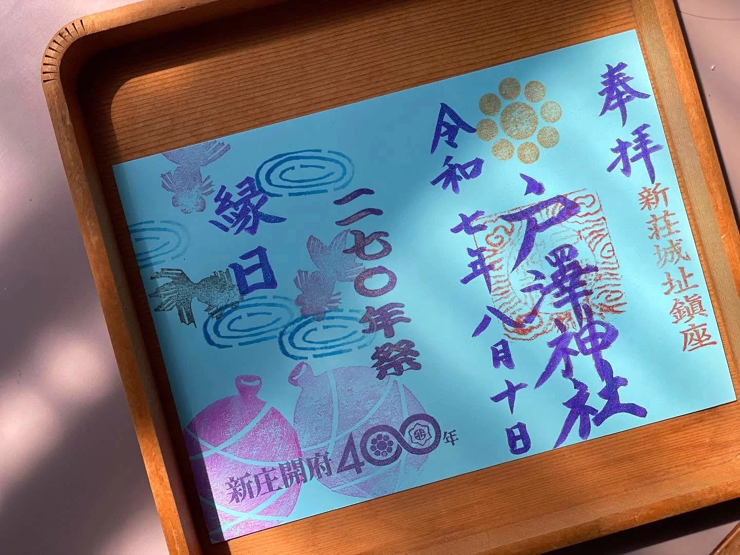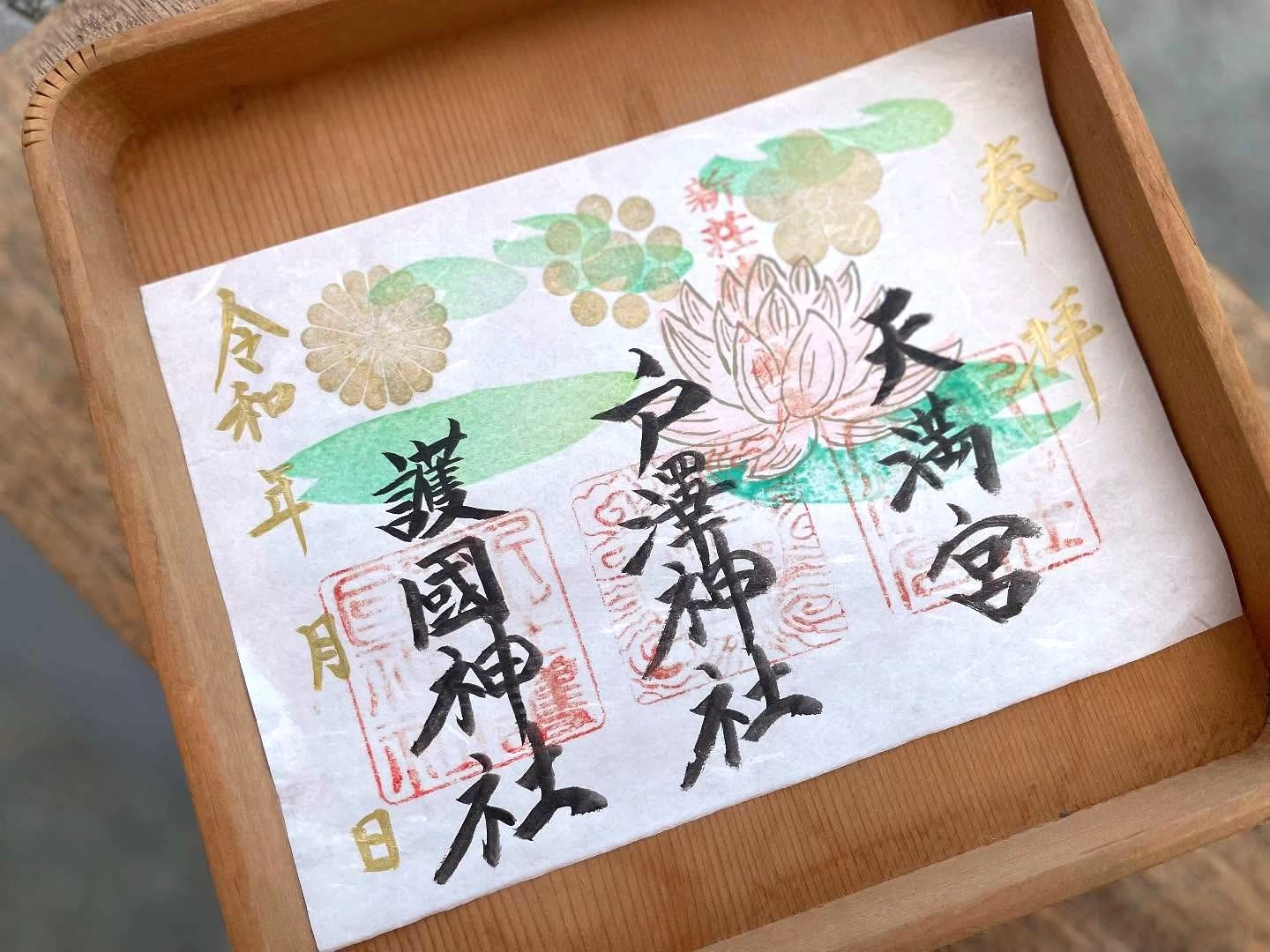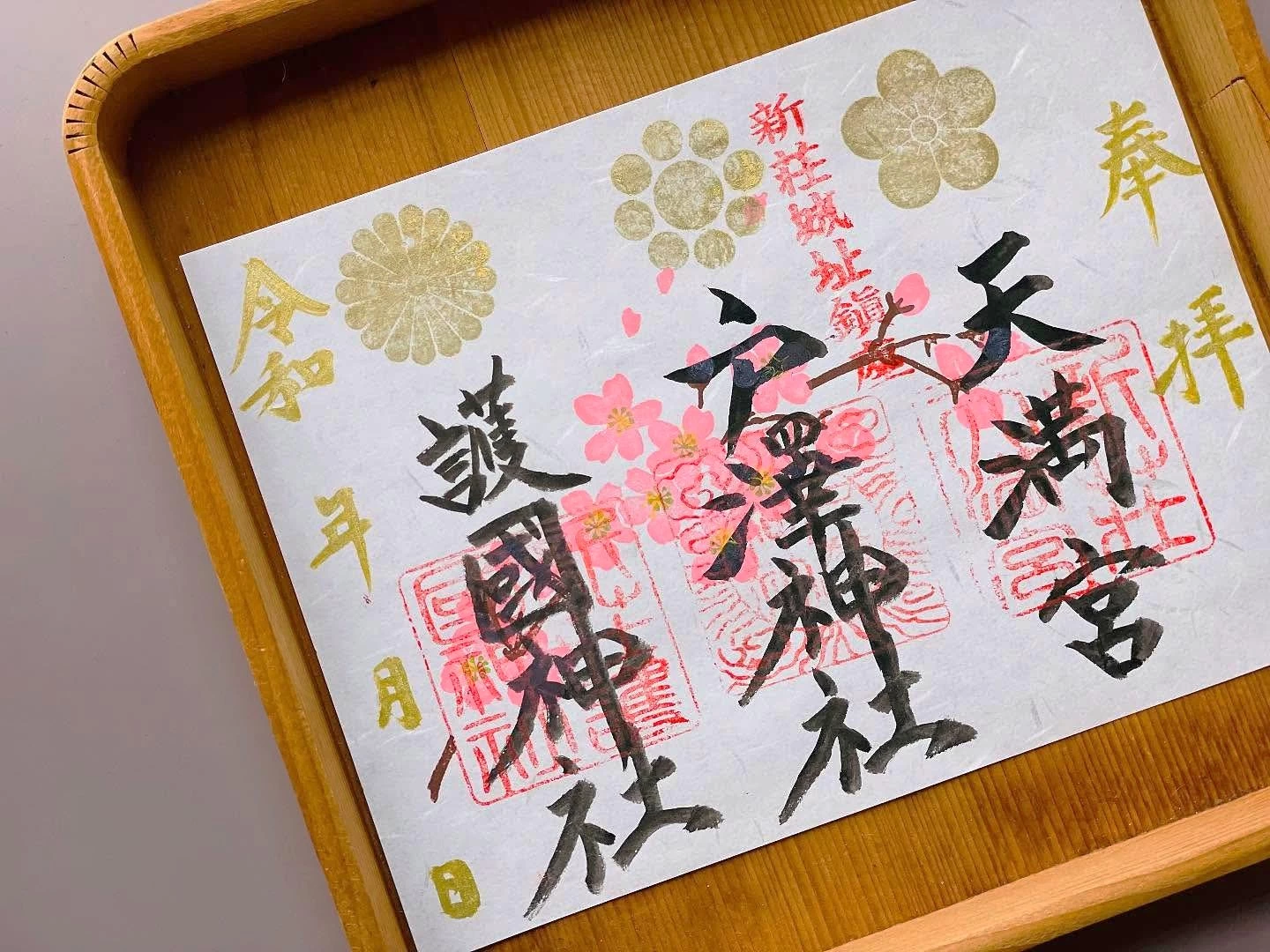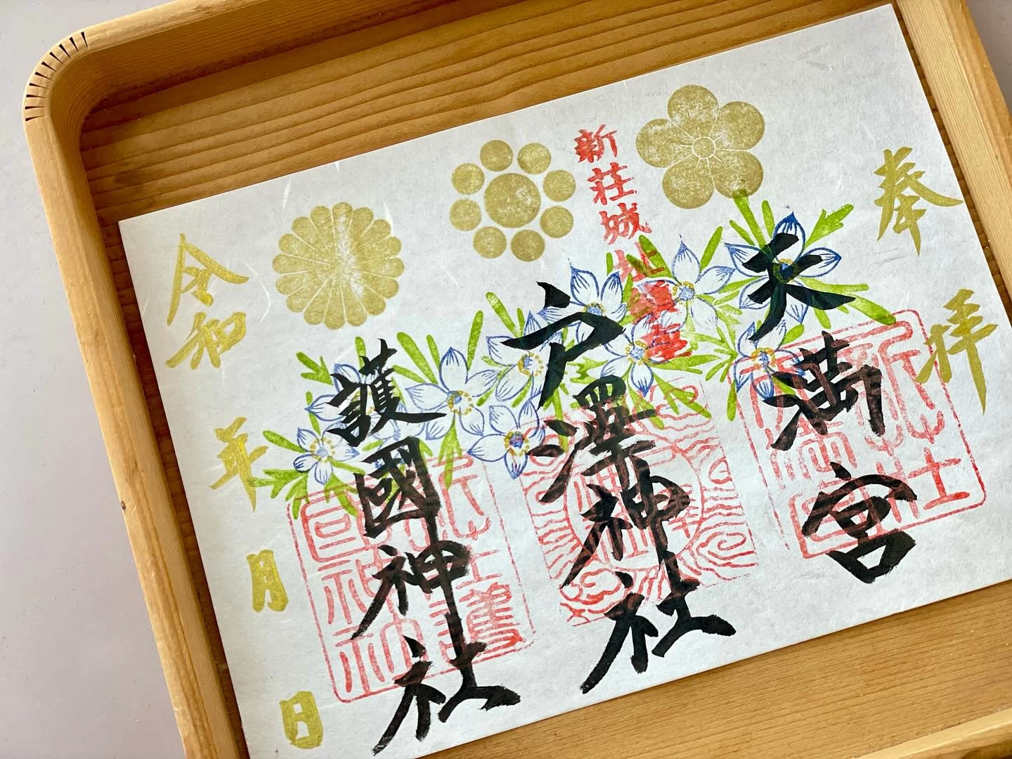 手彫りの印など創造的なデザインの御朱印が頒布されている。境内をともにする3社を見開きにまとめためずらしい御朱印や、月、年、季節ごとの御朱印、期間限定のものなど種類豊富。御城印もある。