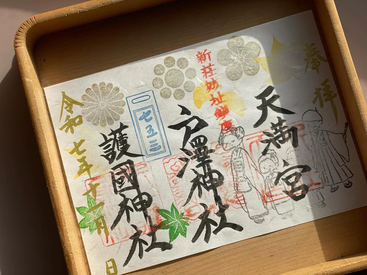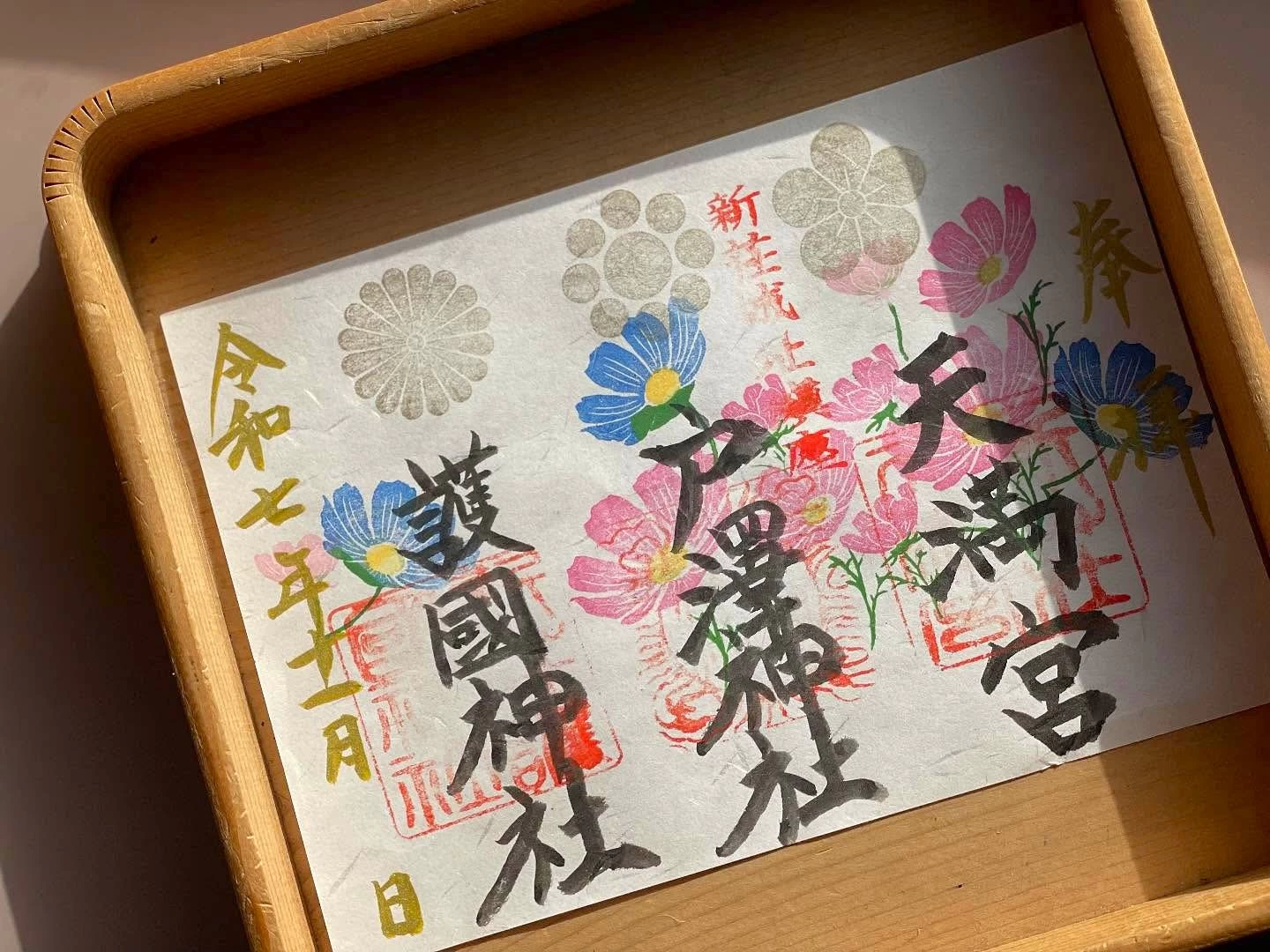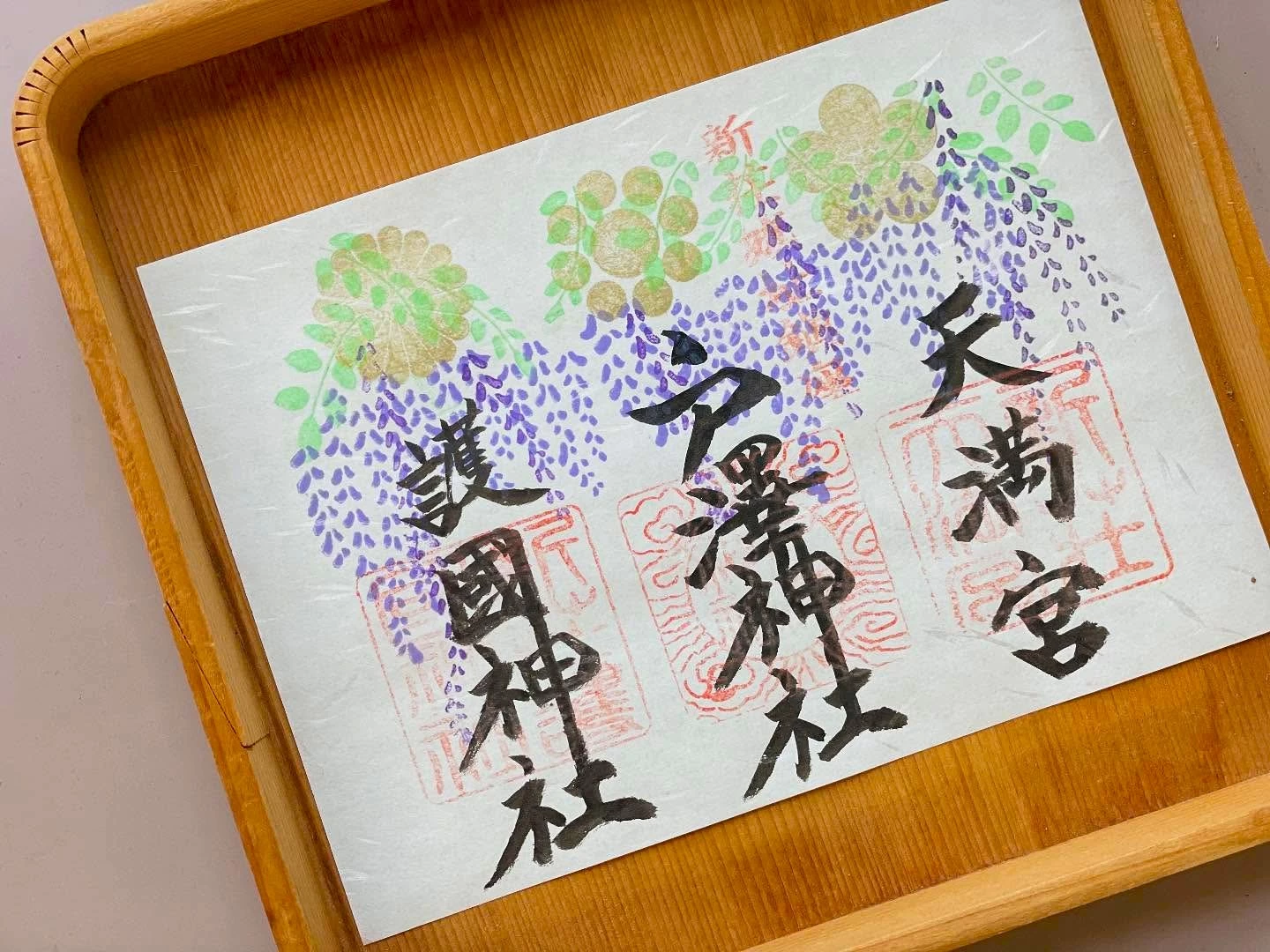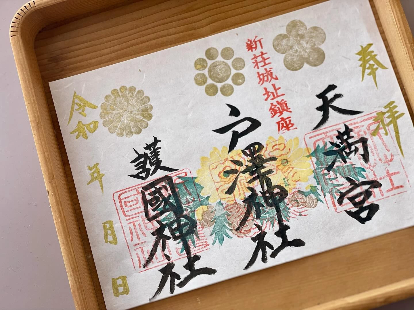 手彫りの印など創造的なデザインの御朱印が頒布されている。境内をともにする3社を見開きにまとめためずらしい御朱印や、月、年、季節ごとの御朱印、期間限定のものなど種類豊富。御城印もある。