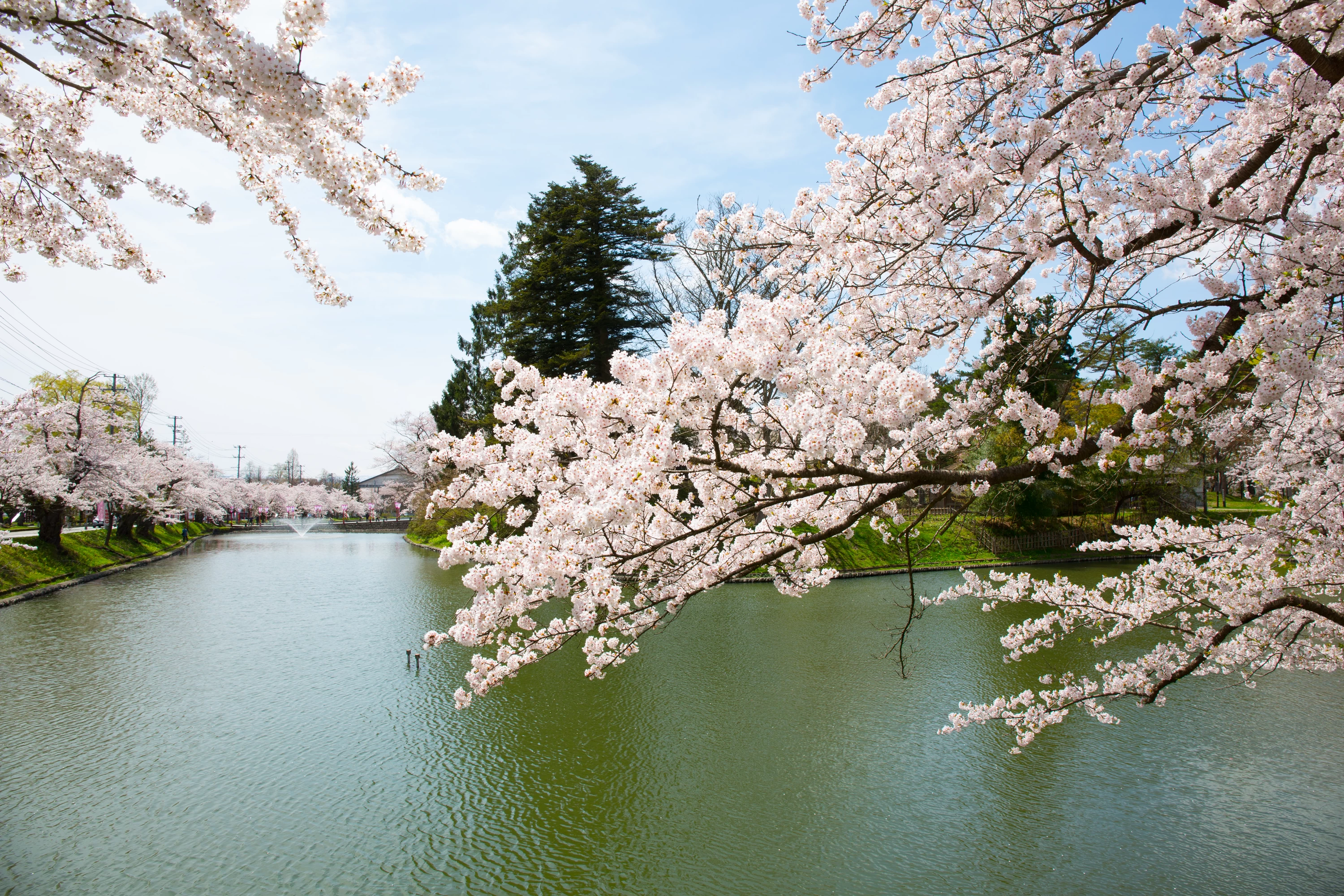 JR新庄駅から車で約5分の新庄城跡に鎮座する戸澤神社。公園となっている城跡に戸澤神社、新荘護国神社、新荘天満宮が鎮座し、お堀や生垣と桜並木のコントラストが美しく、お花見スポットとして人気を呼んでいる。戸澤家の始祖戸澤飛彈守衡盛(とざわひだのかみひらもり)公、新庄移封当時の藩主戸澤右京亮政盛(とざわうきょうのすけまさもり)公、11代藩主戸澤正實(とざわまさざね)公を祀り、社殿に保存されている戊辰戦争の際に官軍の旗印として授かった菊花御紋の旗は、靖国神社と戸澤神社にのみ現存する。
