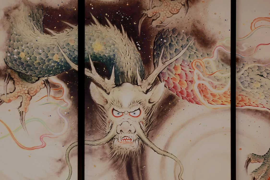 ふすま絵に登場するのは、色鮮やかな5色の龍王。豊かな色彩で描かれた龍図の迫力には圧倒されることだろう。描かれた物語の進行に合わせて、順番どおりに拝観するのがおすすめ。作者が仕掛けた“茶目っ気のある表現”も見つけてみたい。公開時期はツツジや藤の花がきれいなGW頃と、紅葉シーズンの11月末頃で、和室の窓から見える風景も楽しめる。