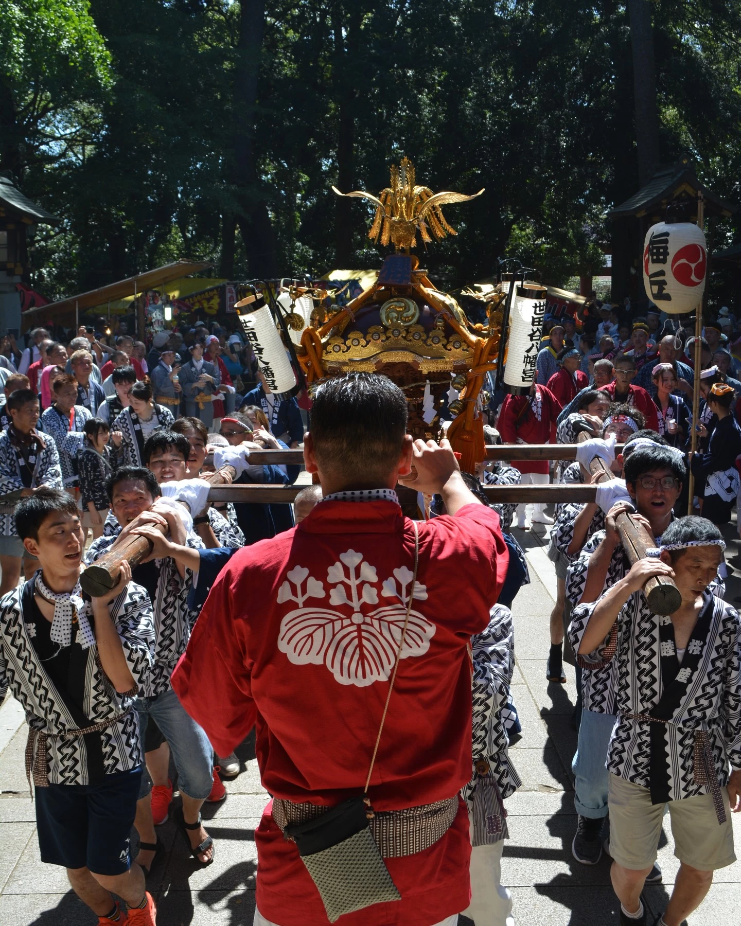 江戸時代、世田谷八幡宮では奉納相撲が行われ、渋谷区の渋谷氷川神社、品川区の鹿嶋神社と並び「江戸三相撲」のひとつに数えられ盛り上がりをみせていた。奉納相撲は五穀豊穣・無病息災・勝運などを祈願して行われるもので当時非常に重要視されており、取り組みの勝敗で吉凶を占ったともいわれている。世田谷八幡宮では八幡信仰と武道の結び付きのなかで力強く伝承され、境内には今も立派な土俵が存在する。土俵の周りには見下ろすような形で石段の桟敷席が設けられ、さながら野外円形劇場といった趣。毎年9月の例大祭では、地元の東京農業大学相撲部による奉納相撲が行われ、集まった地元の人々や相撲ファンから盛大な声援と拍手が送られる。江戸時代に武士の鍛錬から庶民のものへと変化し、隆盛を極めた相撲。世田谷八幡宮では現代も、神事としての伝統が脈々と受け継がれている。