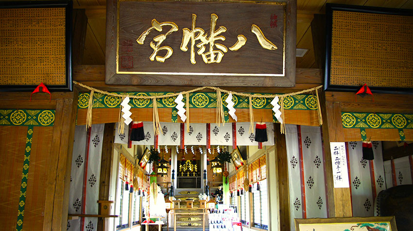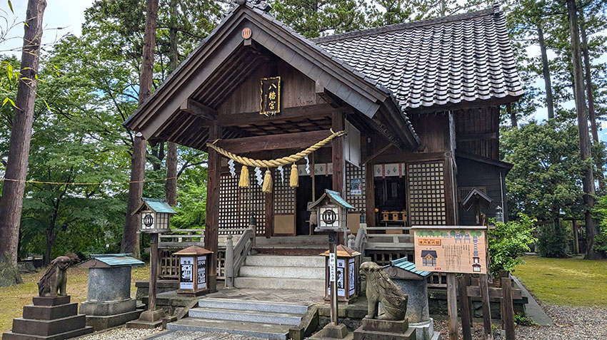 屋根は切妻造・平入りで、落ち着いた雰囲気を持つ木造の社殿が2つ前後に並ぶように配置された独特の様式が特徴。この様式は、本殿と幣殿、拝殿が一直線に並び前後に連結させた、八幡宮の由緒ある建築構造を踏襲している。社は明治時代に再建しており、現在残っているもののうち一番古いといわれている資料は御手洗の水盤で、1796年(寛政8年)遷宮の際に寄進されたことが書かれている。例大祭の際に御渡りする神輿は、“皇紀二千六百年記念事業”として、1940年(昭和15年)に寄付金にて作られ、人々の信仰心の強さと、地域の守り神としての永い歴史がうかがえる。狛犬や石灯籠、ほこらなどが配され、厳かな空気が漂う境内には、複数の末社があり、古くから鎮座する木花咲耶姫命をお祀りする「子安神社」では、安産祈願の際にはお守り、お札、安産祈願の絵馬を授かることができる。