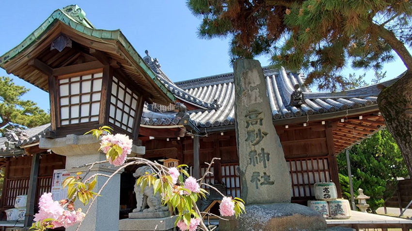 加古川バイパスの加古川西ランプから車で南へ約10分、山陽電気鉄道高砂駅から徒歩約15分の場所に佇む「高砂神社」。結婚式でうたわれる謡曲「高砂」の舞台といわれ、“尉と姥”の伝説にまつわる縁結びや長寿の象徴“相生の松”が境内に立つ。社殿の瓦には姫路藩主・本多家の家紋である“立葵”が刻まれているほか、地元・兵庫県高砂市生まれの江戸時代における実業家・工楽松右衛門の立像もあり、さまざまな歴史が感じられる。月替わりの御朱印やお守りなどオリジナルの授与品や拝殿横のコーヒースタンドも好評。