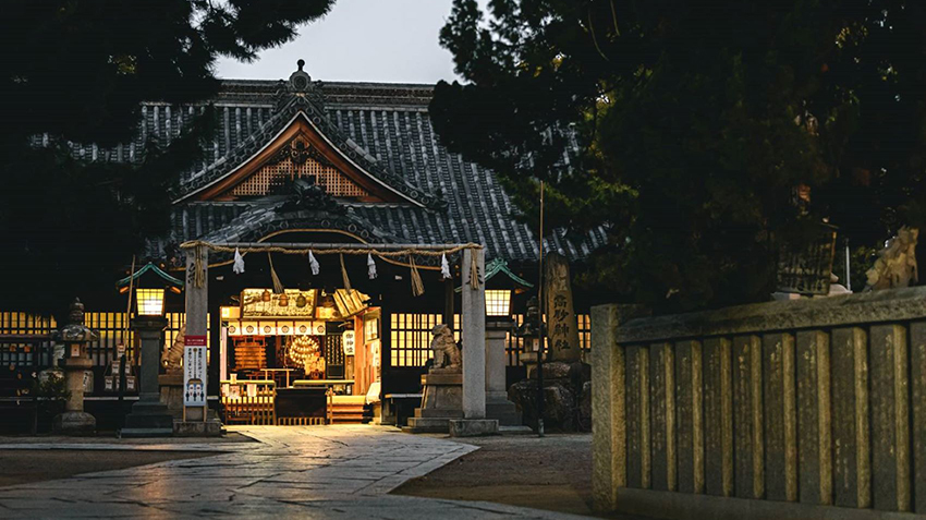 社殿は高砂城築城の際に現在の地から西北にあったとされる松林へ移転。現在の本殿は1615年(元和元年)に江戸幕府から出された一国一城令による高砂城の廃城に伴い、姫路城主・本多忠政公の支援を受けてこの地に再建されたもの。桃山時代の建築様式を受け継ぐ本殿の屋根の丸瓦には、本多家の家紋である“立葵”が刻まれ、本多家からの篤い信仰がうかがえる。古くは「牛頭天王社」と称された社は素戔嗚尊(すさのうのみこと)、大己貴命(おおなむちのみこと)、奇稲田姫命(くしいなだひめのみこと)を祀り、縁結び、夫婦円満、長寿といった御利益を願う人々の信仰を集めている。社殿の北側にはかつて加古川水運の終着地として栄えた堀川が東西に流れ、社には加古川水運にまつわる絵馬が今も残るほか、帆船技術を改良した工楽松右衛門の立像があり、文化と交通の歴史にも触れることができる。