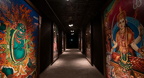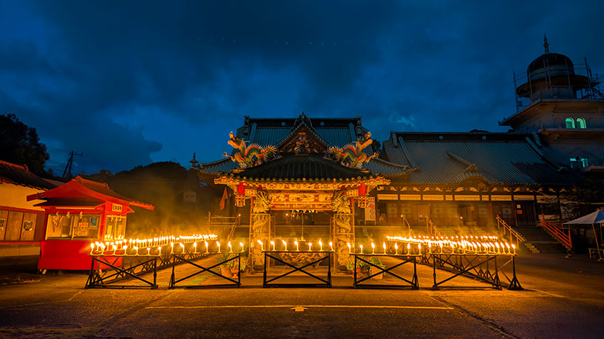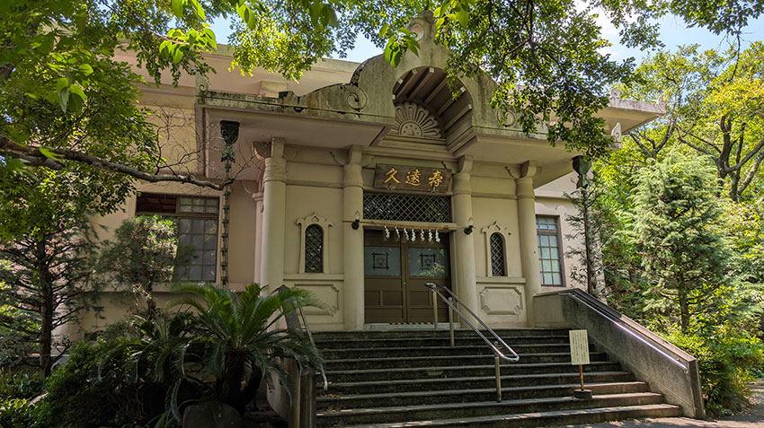 四天王や七福神のひとりとして知られる毘沙門天のルーツは、インド神話の富と財宝の神クベーラ。仏教伝来とともに日本に伝わり聖徳太子の助けになったことが信仰の契機となった。武将のような姿で甲冑をまとう戦の神でもあり、勝負運・開運・財運の神様と親しまれる。大学教授でもあった22世上人が、アジア各国の建築様式を混在させ表現したオリエンタルな伽藍は見どころがたくさん。鳥居をくぐると境内中央には台湾様式の「龍神香炉堂」があり、香炉の煙は龍となって願いを叶えてくれるといわれ富士山とともに写真に収めることができる。インド・チベット様式の「洞窟七福神堂」の塔には仏陀の眼が描かれ過去と未来を見据えており、日本建築「本殿」は木造入母屋造。向拝に七福神が透かし彫りされている。そのほかパキスタン様式の「道場」など多様な文化に触れられるのが面白い。