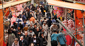 - 毎年1・2月はダルマの姿にラッピングした「だるま電車」が運行されるなど、「毘沙門天大祭だるま市」は街全体で盛り上がる。