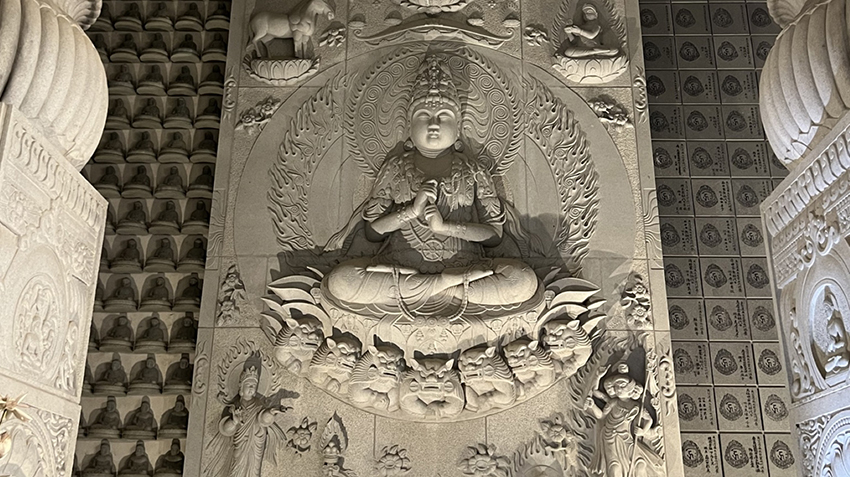 本堂は八角円堂というめずらしい構造で、室町時代の作である御本尊・十一面千手観音菩薩像を祀っている。本堂の正面には、御本尊を礼拝するための御堂で、国指定の重要文化財である礼堂が配置され、さらにその前方には同じく重要文化財である三重塔が立ち、古くから続く伽藍配置の優美さを今に伝えている。境内では、歴史が感じられる建造物と合わせて、春の桜、夏の深緑とアジサイ、秋の紅葉、冬は雪景色といった四季折々の景色が訪れる人々の目を楽しませてくれる。現在はインドとの交流を通じて、約20mの高さを誇る「天竺渡来 大観音石像」をはじめとした巨大石像群や、総重量約1,500tの壮大な石の御堂「天竺渡来 大石堂」など、異国の趣を添える建造物も立ち並び、古くから伝わる信仰と、現代の国際的な慈悲の精神、そして自然が調和する霊場として参拝者が絶えない。