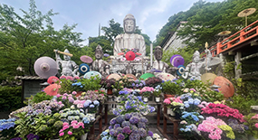 境内の至る所に飾られた色とりどりのアジサイや、アジサイに囲まれた圧巻の“紫陽花大仏”を見ることができる。4カ所の古刹を巡る「大和あじさい重ね色巡礼」も開催。 |