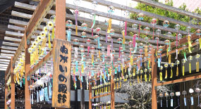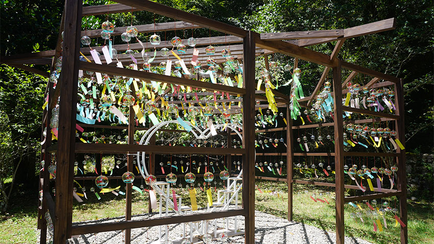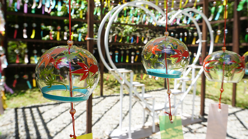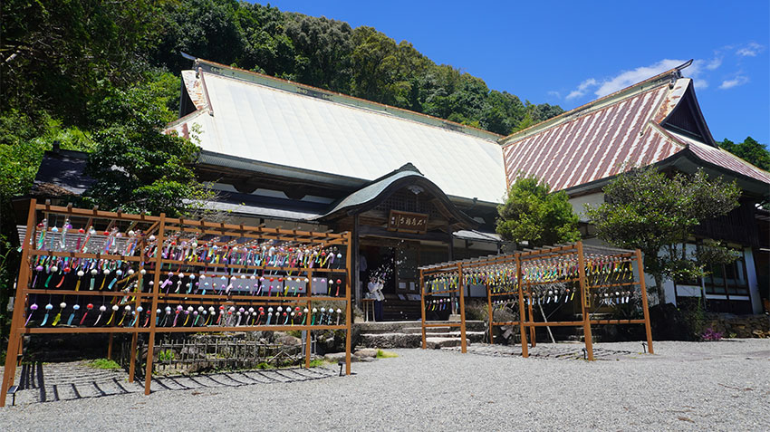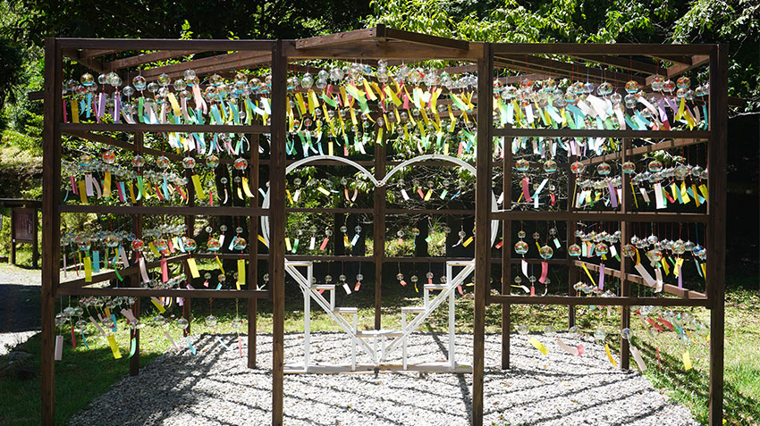 本堂の前にある“ねがいの風鈴”のほかに、境内の奥には“幸せの風鈴”が鳴り響く風鈴棚がある。愛の象徴であるハートの形のオブジェを中心に設置し周りを囲むように組み上げた棚につるされた風鈴には、参拝者の幸せと縁結びの願いが込められており、風に揺れるその美しい姿はフォトスポットとしても好評。風鈴をモチーフにした御朱印をはじめ、カイドウ、桜、紅葉といった、寺院の四季折々の自然を表した切り絵の御朱印、お洒落なデザインで持ち歩きやすいお守りなど、寺とのご縁をつなぐ授与品も多彩に用意されている。現在は子どもから大人まで、そして九州だけではなく国内外から多くの人々が参拝に訪れ、親しみやすく気軽に立ち寄ることができる熊本県人吉市の観光スポットとしても人気を集めている。
