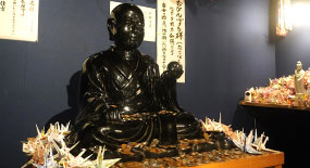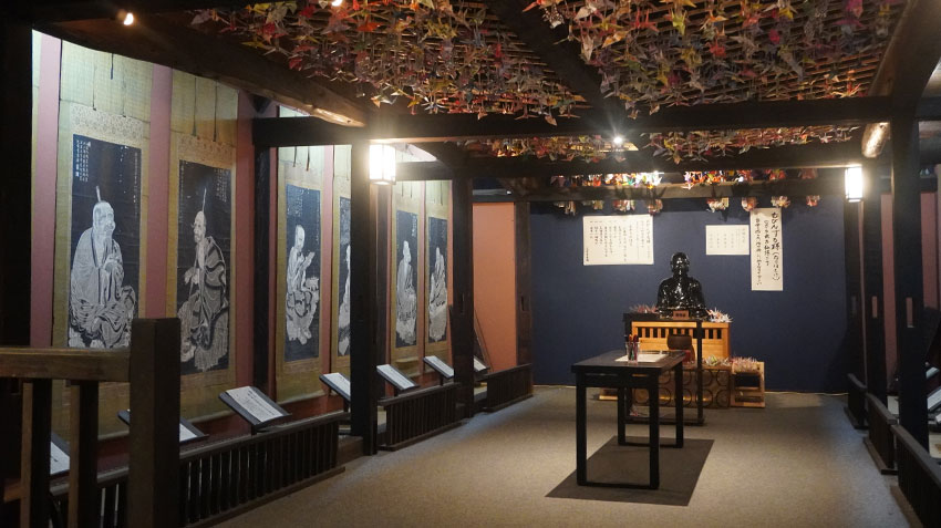 鳳儀山と号し、室町時代の1417年(応永24年)に開創された「石水寺」。同じ熊本県人吉市に立つ永国寺の開山僧でもある実底超真和尚が、当時一帯を治めていた相良前続公の支援を受け、隠居寺としてこの寺を建立し、球磨地方に曹洞宗を広めた。その後、幾度の変遷を経て1796年(寛政8年)、13代良丹和尚により現在の本堂が造営された。本堂は“円通殿”とも呼ばれ、御本尊に頭上の11の顔で全方向を見守り、民衆の苦しみを救う現世利益の仏として信仰される十一面観音菩薩を祀っている。本堂の屋根裏には秘宝の石版画「十六羅漢図」や「地獄十王図」の掛け軸などを収蔵しているほか、お釈迦様の弟子とされる“十六羅漢”のひとりであり、病気平癒や健康の御利益をもたらす「おびんずる様」の像を祀っており参拝者からも親しまれている。