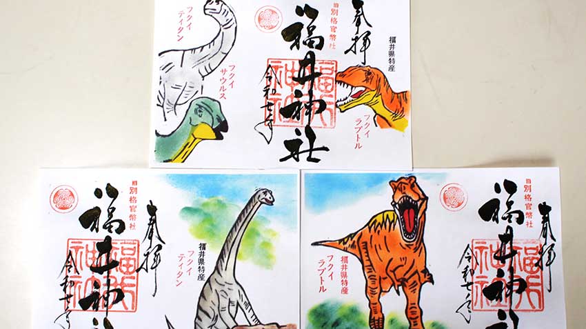 神社ファンや御朱印マニアのみならず、参拝に訪れた人々の話題に上る「福井神社」の御朱印。季節を彩る草花や、その時期の福井県特産物、季節の行事などがあしらわれた複数の御朱印が毎月頒布されている。また、県内の神社で用意される“恐竜王国福井”ならではの御朱印で、神社に縁のあるものと恐竜を掛け合わせた御竜印もある。「福井神社」の御竜印は「福井藩主のトノオドン」。神社の歴史をひも解けば、「福井藩主のトノオドン」がきっと身近に感じられることだろう。通常御朱印に描かれた福井県特産物も、味・香り・食感の良さで知られる「九頭竜まいたけ」や、江戸時代から藩を代表する名産品として将軍家、宮家、他藩への贈り物に重用されてきた「越前仕立て汐うに」など、奥深いエピソードがあるものばかり。御朱印や御竜印は華やかで記念になるため、旅のお土産としても人気が高い。