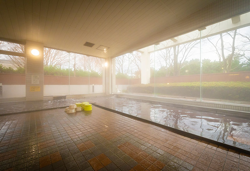 琥珀(こはく)色のモール温泉は“美肌の湯”といわれ、短時間で体の芯までぽかぽかに温まる。「あつめ」「ぬるめ」と2つの浴槽があり、ほかに白湯、超音波バス、寝湯が揃い、屋内なので天候を気にせず楽しめる。早朝やドライブ中などにも気軽に立ち寄ろう。