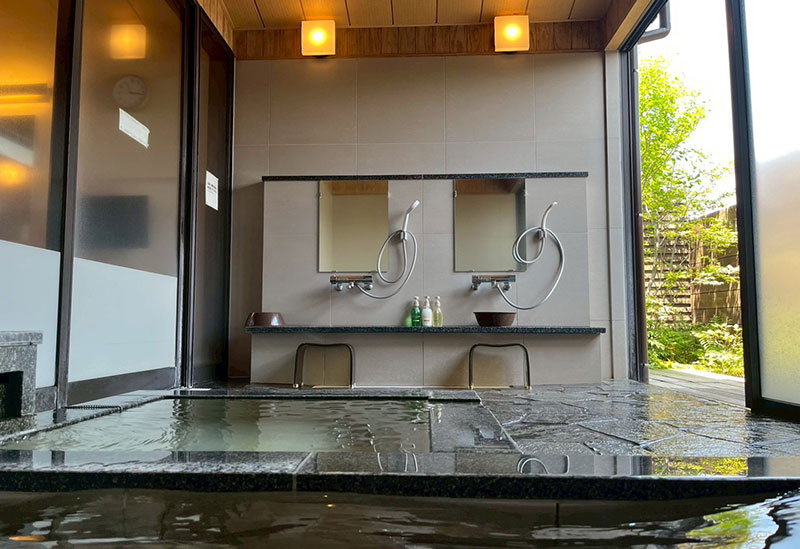 日当山温泉は、美肌効果のあるナトリウム-炭酸水素塩泉の湯が肌の不要な角質や汚れを取り、肌をつるつるにしてくれる泉質。湯の温度は高く、露天風呂と足湯は源泉100%の掛け流し。地下水を混ぜて、お好みで温度を調整することもできる。