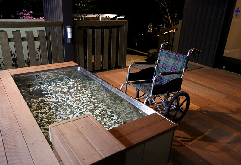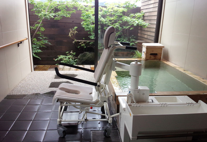 事前予約が可能なリフト付きの部屋が1室あり、大きな温泉施設に行くのが難しい体の不自由な人やシニアにもおすすめ。専用のシャワーキャリーとボタンひとつで入浴できる昇降機が備わっており、貸切のバリアフリー空間なので心置きなく温泉を満喫できる。