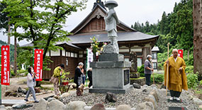 新潟県魚沼市にある真言宗智山派の寺院「常泉寺」。1469年(文明元年)に創建され、550年以上の歴史を持つ。山々や田園といった自然に囲まれた境内には、歴史を伝える荘厳な本堂、力強く描かれた迫力のある五大明王の仏画があり、地域の人々はもちろん観光で訪れる人も多いという。例年夏に行われる子ども向けの修行体験「寺子屋」、毎月開催される“阿字観”という真言密教の瞑想(めいそう)法の体験のほか、住職の妻が手がける絵入りの御朱印を頒布するなど、親しみやすい信仰の場として人気を集めている。
