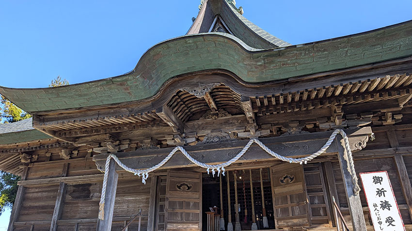社殿は現在地に遷座した1710年(宝永7年)に、庄内藩主・酒井氏の寄進により創建されたもので、伝統的な佇まいの神社建築を誇っている。ほぼ当時のままの姿が残る拝殿は、切妻造平入の銅板葺きで千鳥破風が付き、唐破風のある向拝を設け、落ち着いて参拝できる空間が演出されている。拝殿の後方に位置する本殿は再建されたもので、流造の優美な曲線が、まるで御祭神・菅原道真公の気品を後世に伝えているかのようだ。境内には菅原道真公と関係の深い梅の木や、願いを込めて奉納された梅の種が埋められている「梅塚」、そのほか「孝行橋の石碑」「金剛力美濃守述久の石碑」などがある。四季折々の花が静かに咲き誇る空間は、訪れる人々の癒やしの場となっており、特に秋には見事に色付く紅葉を眺めることができる。
